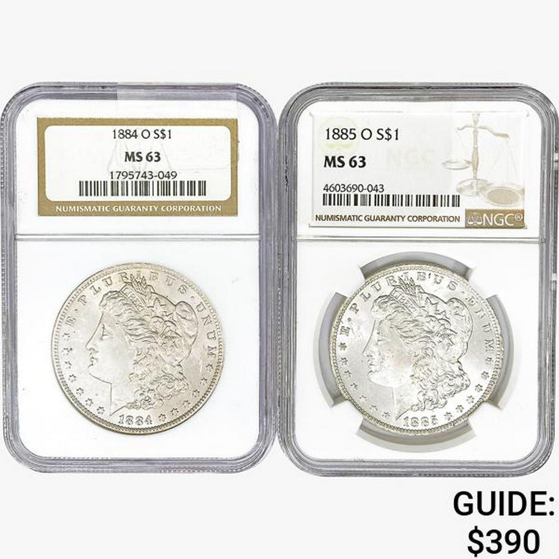 [2] Morgan Silver Dollars NGC MS63 [1884-O, 1885-O]