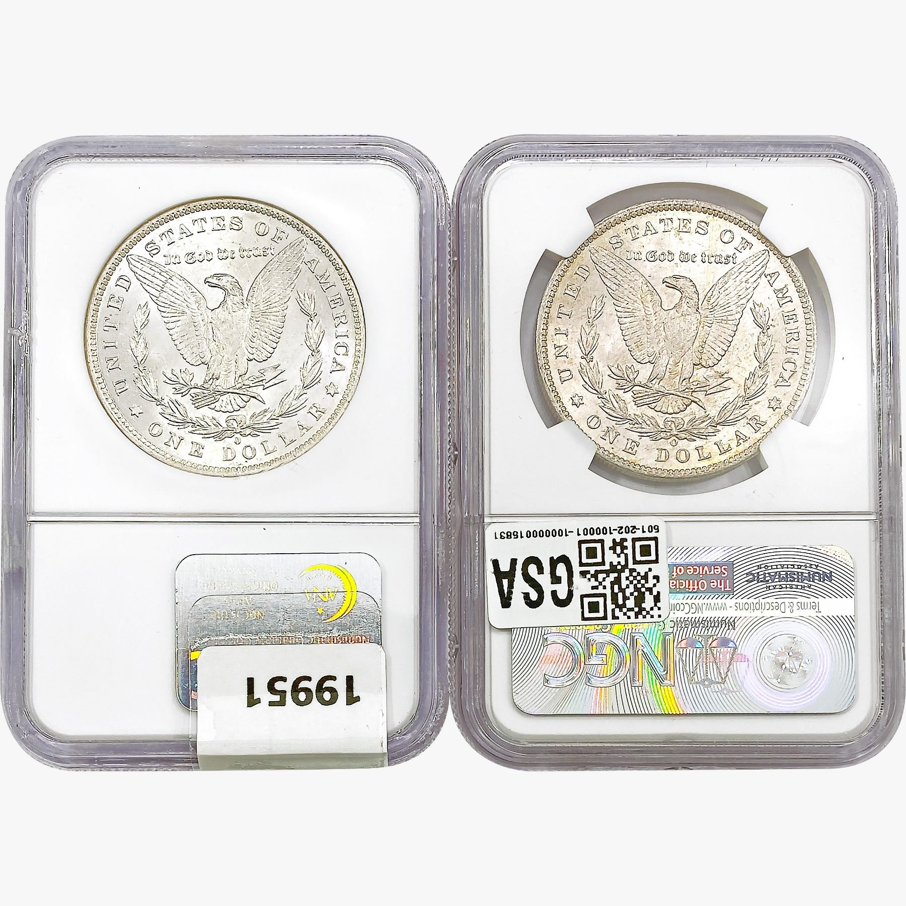 e. Coins sold referencing a third-party grading service are sold “AS IS” without any express or implied warranty, except for a guarantee by GSA that they are genuine. Removal or alteration of the holder, voids all of Bidder’s claims concerning that Product. Certain warranties may be available from the grading services and Bidders are referred to them for further details: Numismatic Guaranty Corporation (NGC), PO Box 4776, Sarasota, FL 34230, www.ngccoin.com/services/writtenguarantee.asp; Professional Coin Grading Services (PCGS), PO Box 9458, Newport Beach, CA 92658, www.pcgs.com/guarantee.html; ANACS, 6555 S. Kenton St., Ste. 303, Englewood, CO 80111; and Independent Coin Grading Co. (ICG), 7901 East Bellview, Ave., Suite 50, Englewood, CO 80111.