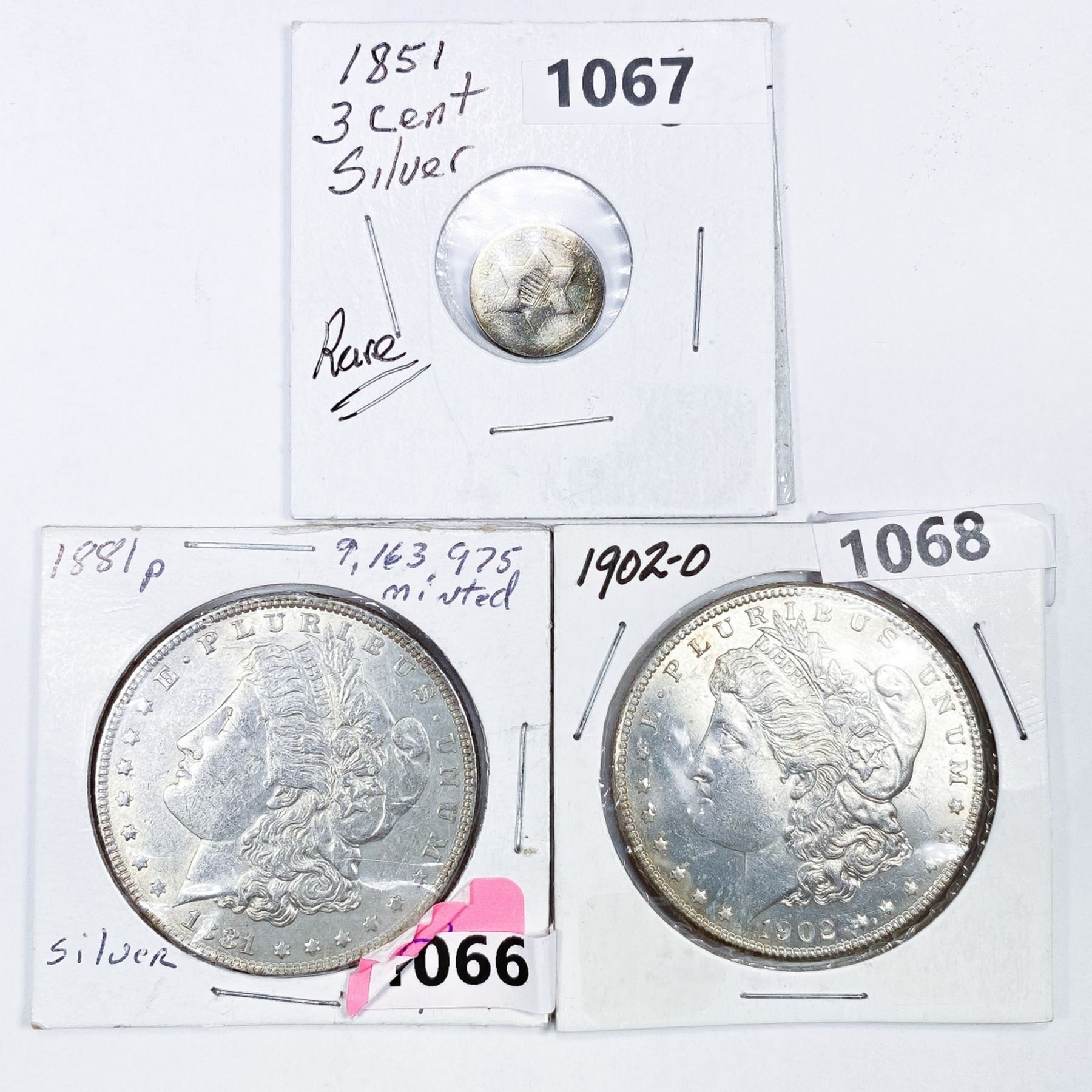 1881 Morgan Silver Dollar UNCIRCULATED, 1851 Silver Three Cent UNCIRCULATED, 1902-O Morgan Silver Dollar UNCIRCULATED