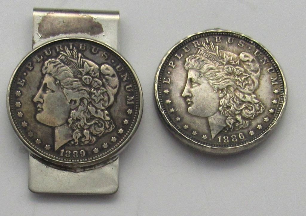 1886 and a 1889 Morgan Silver Dollars set in Pendants and key chain pendant is broke