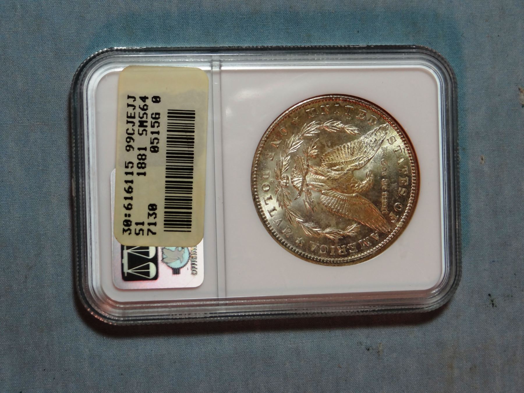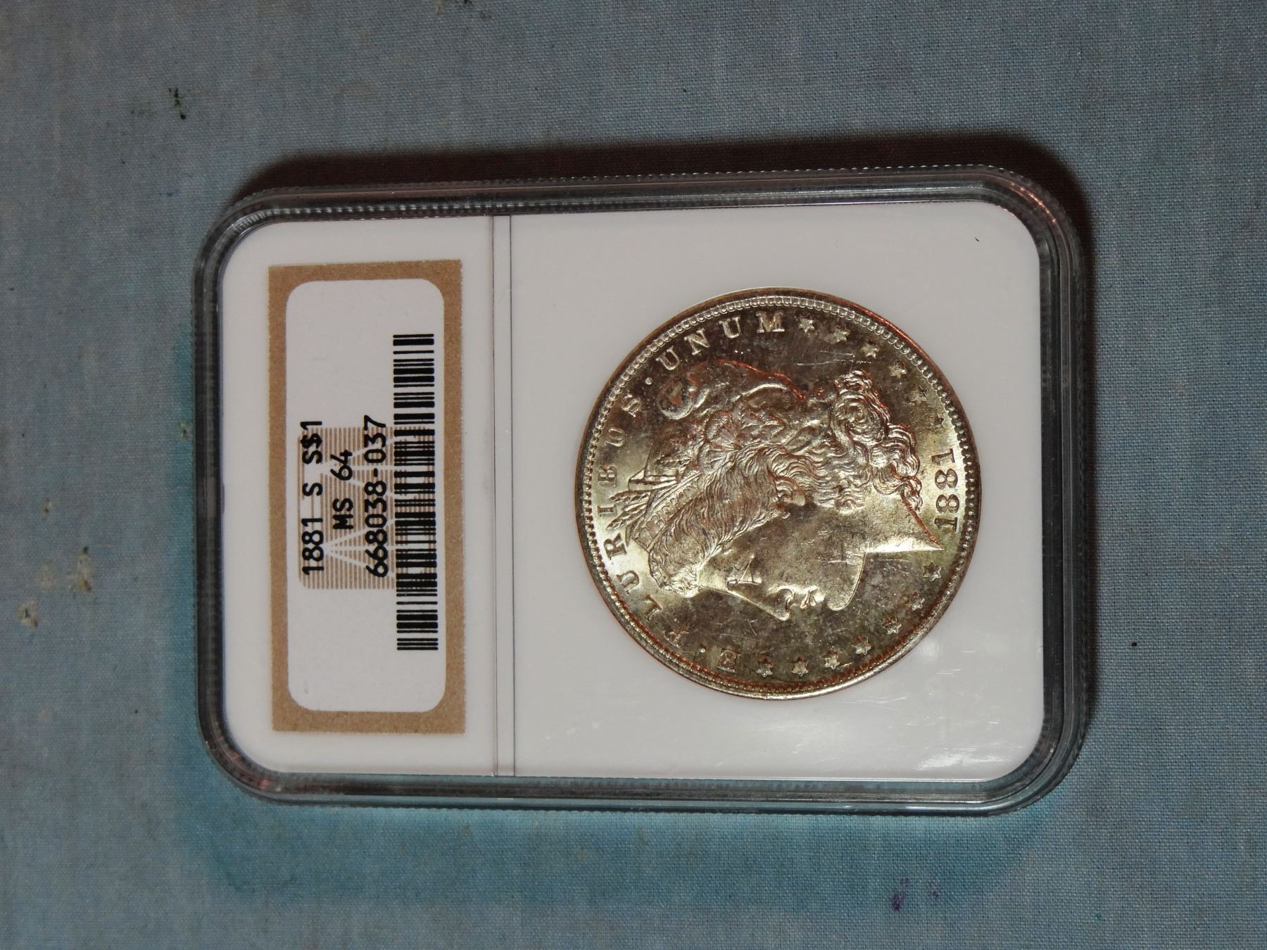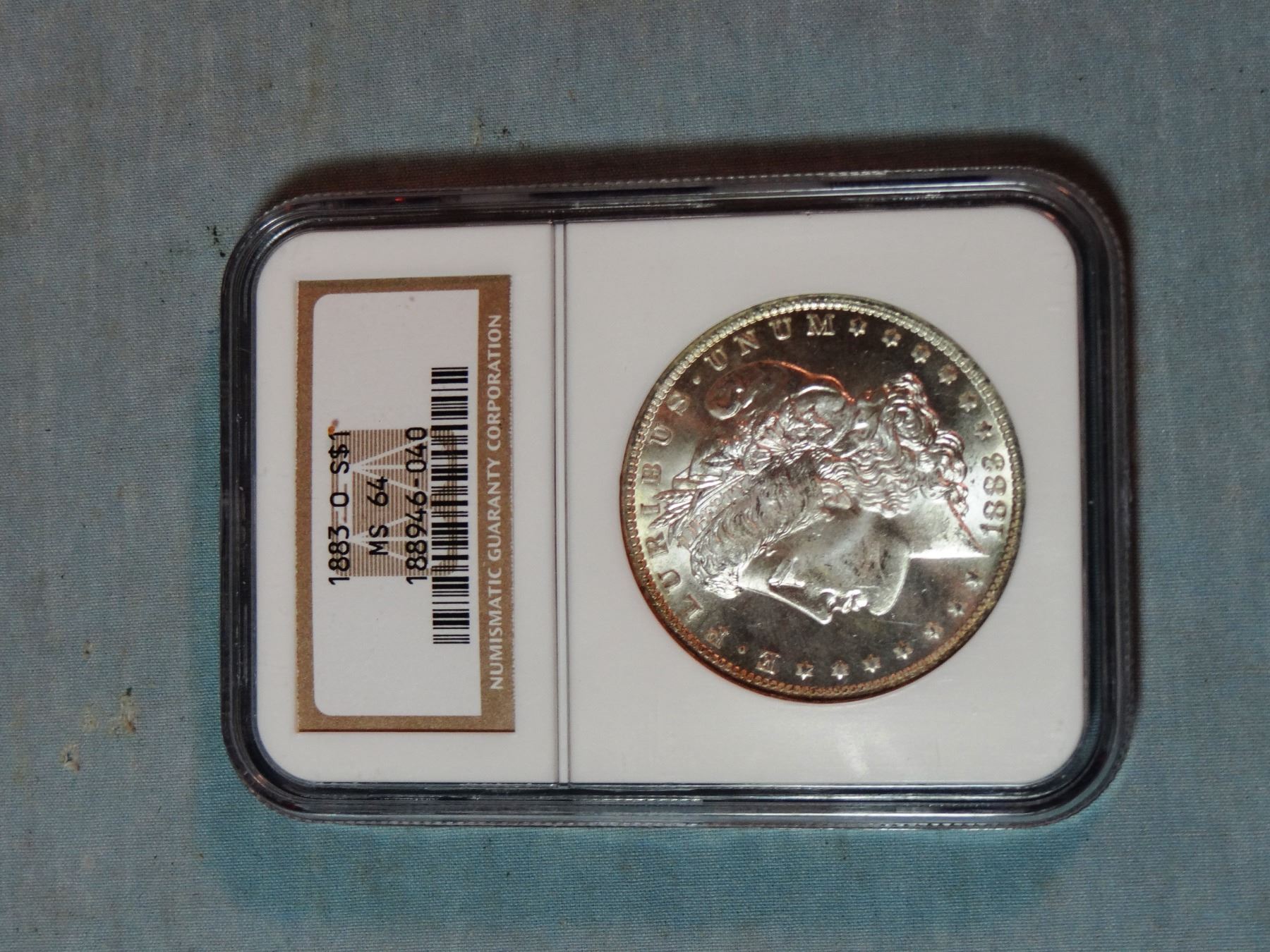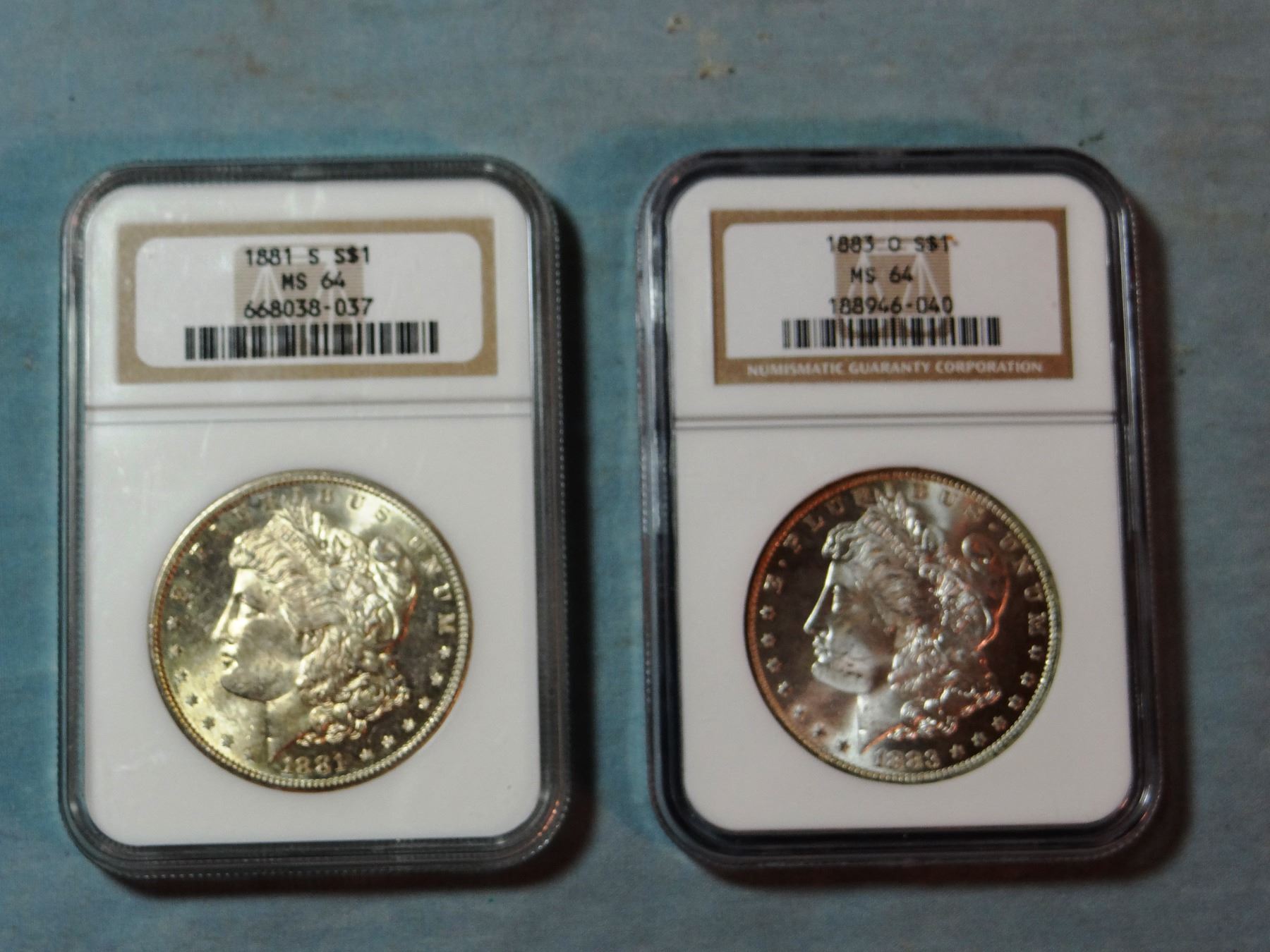2 Morgan dollars, 1881-S and 1883-O, both NGC 64