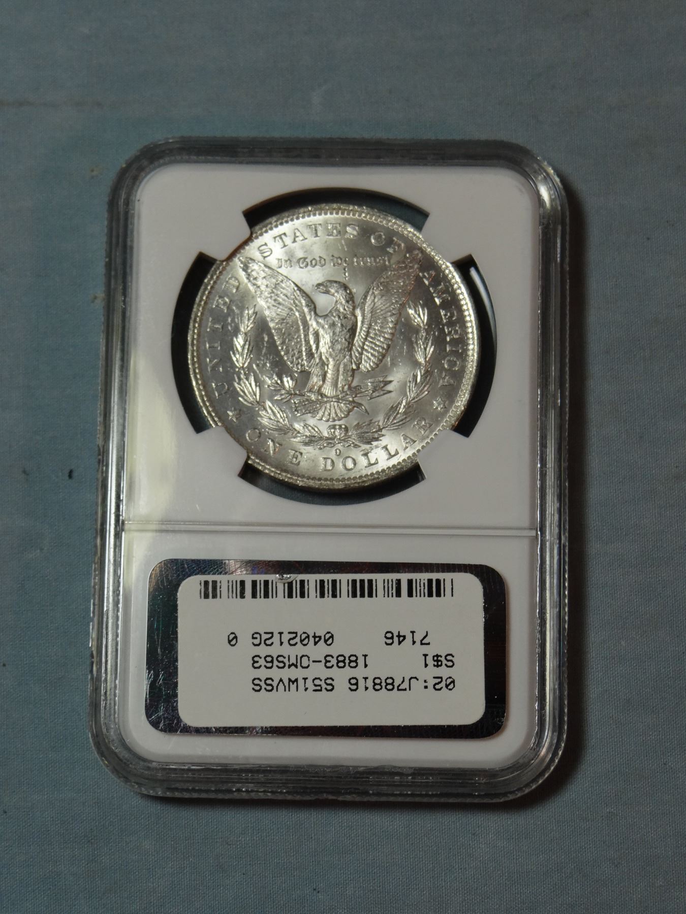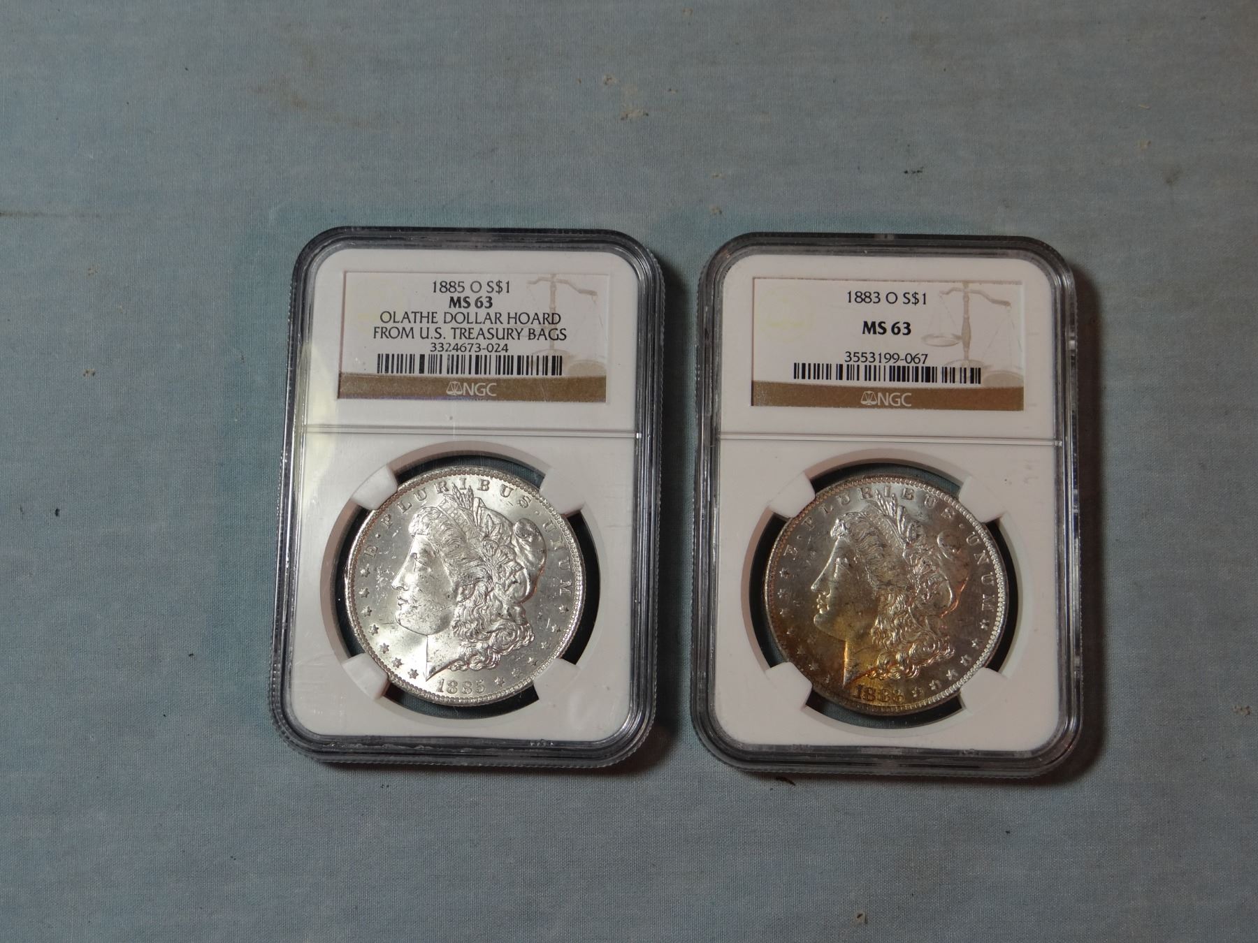 2 Morgan dollars, 1883-O and 1885-O, both NGC MS 63