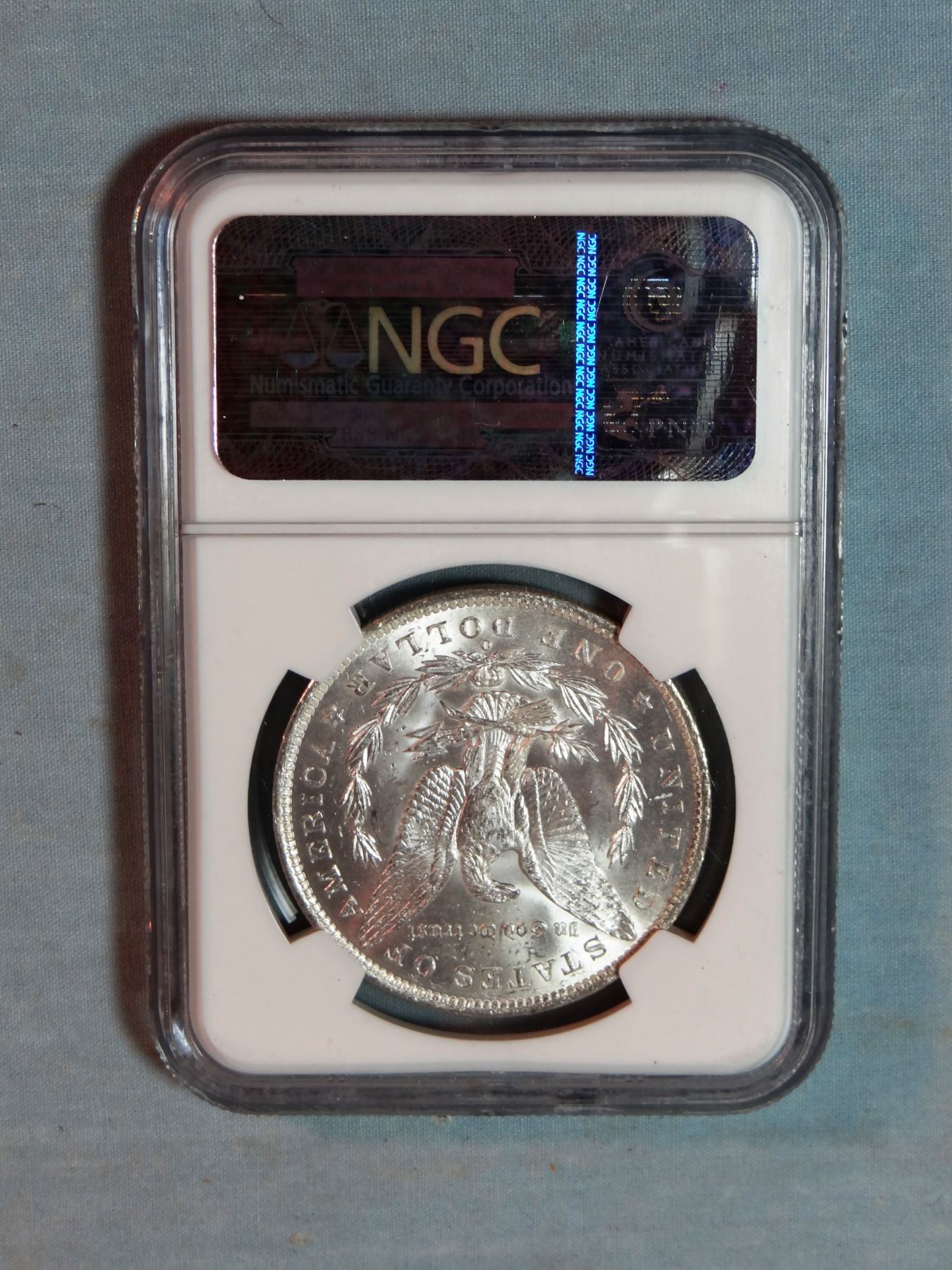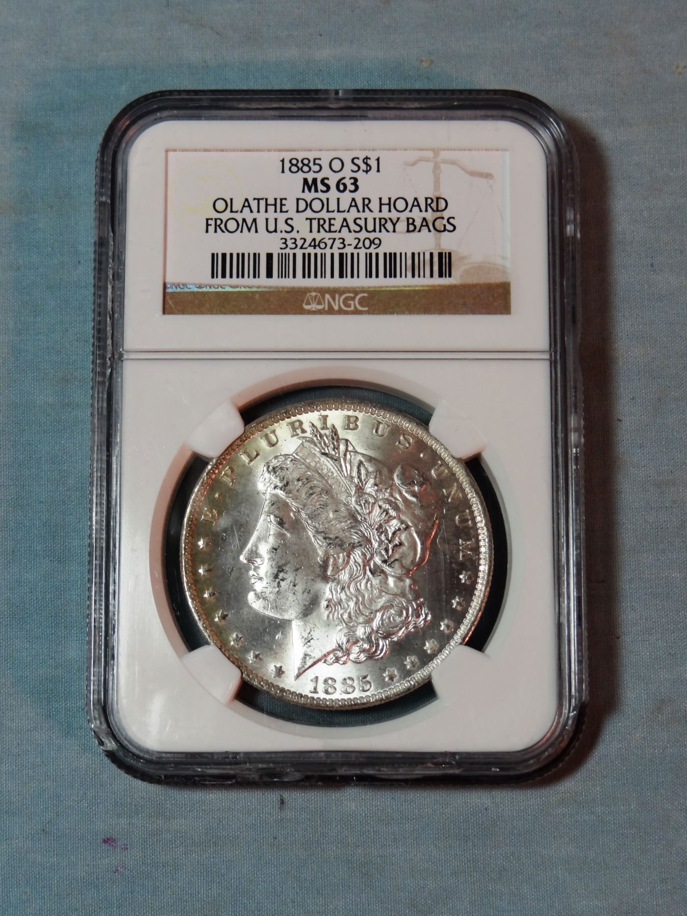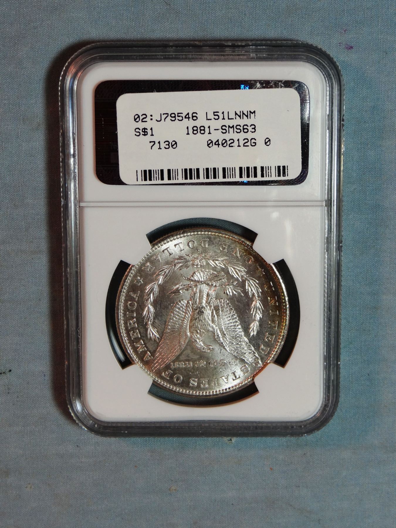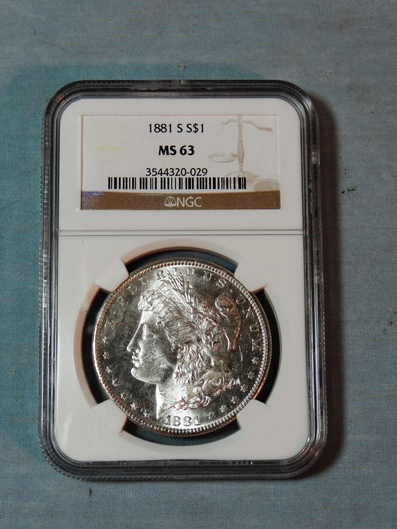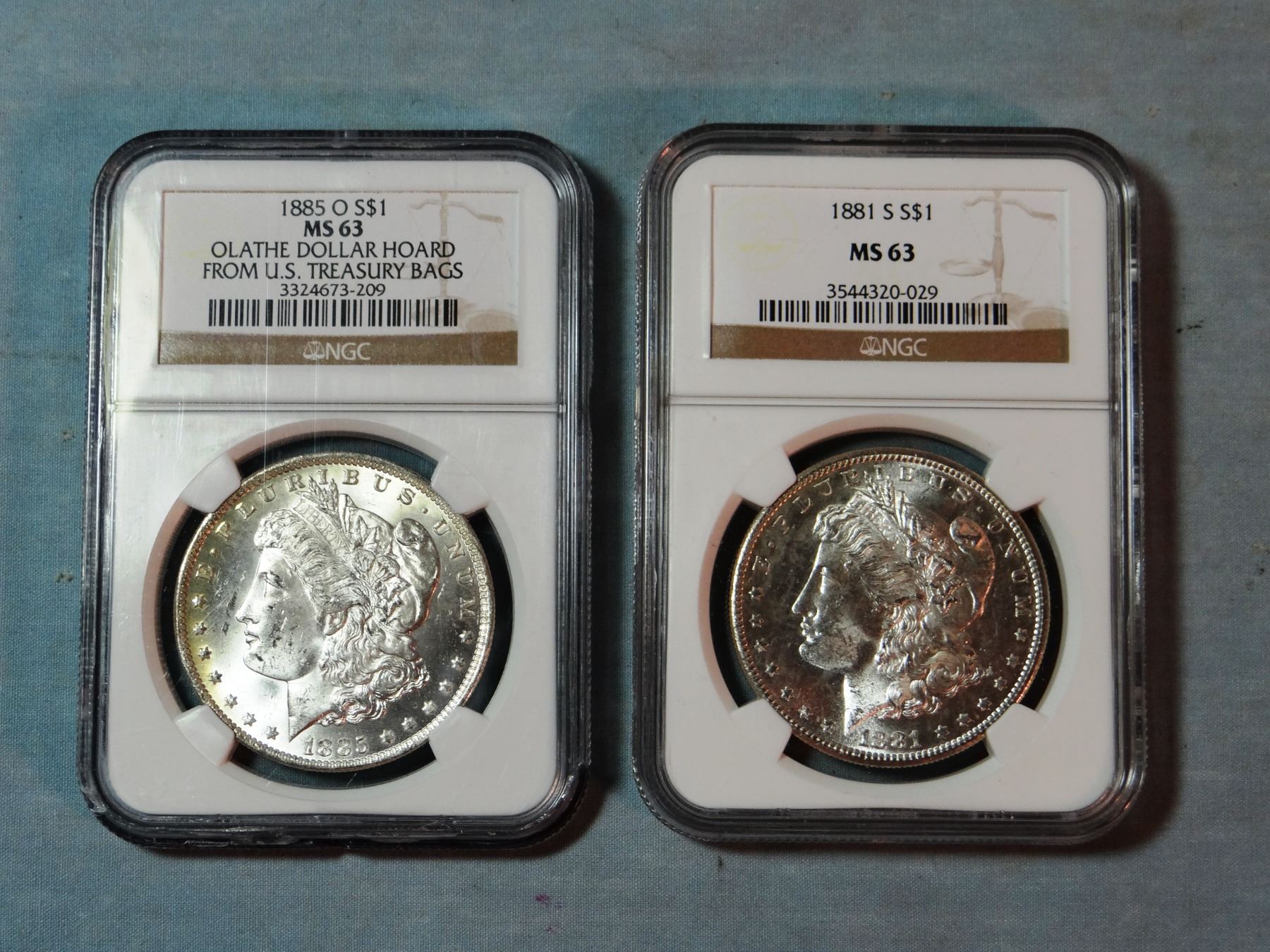 2 Morgan dollars, 1885-O and 1881-S, both NGC 63