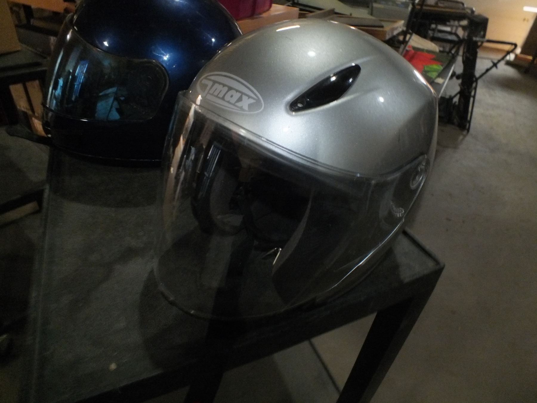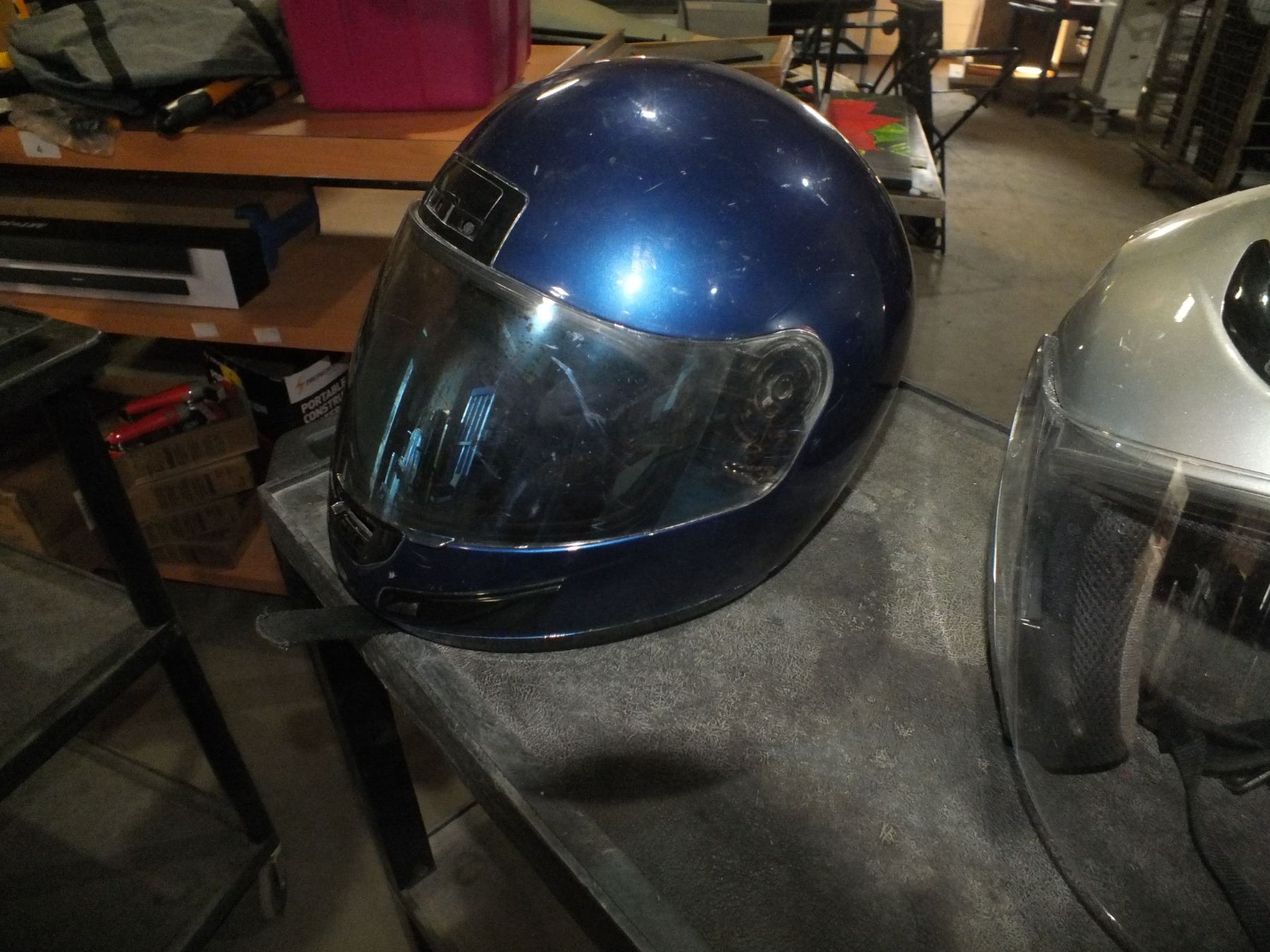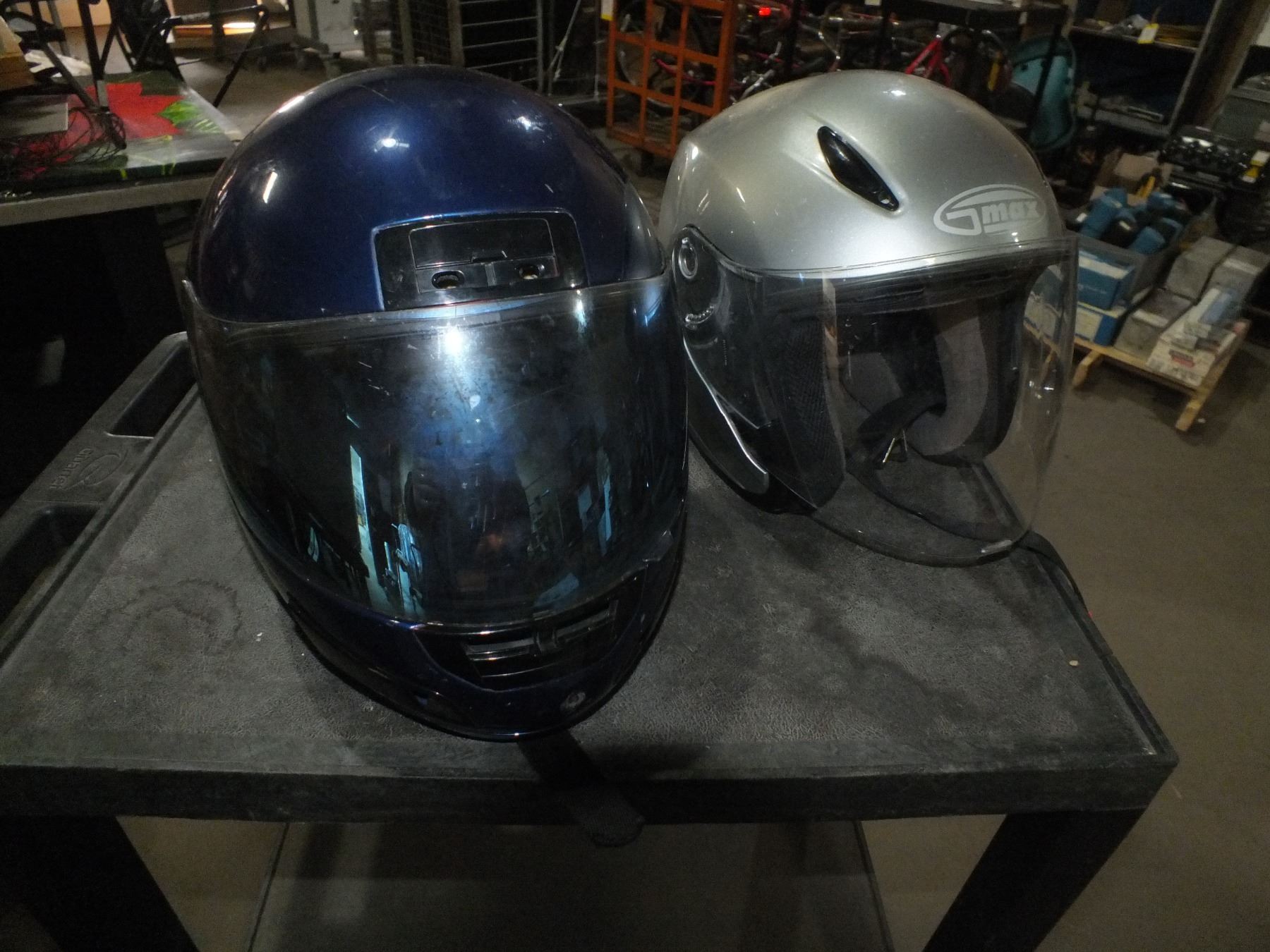 2 Motorcycle Helmets, the blue one is size large and the grey is size Med...used