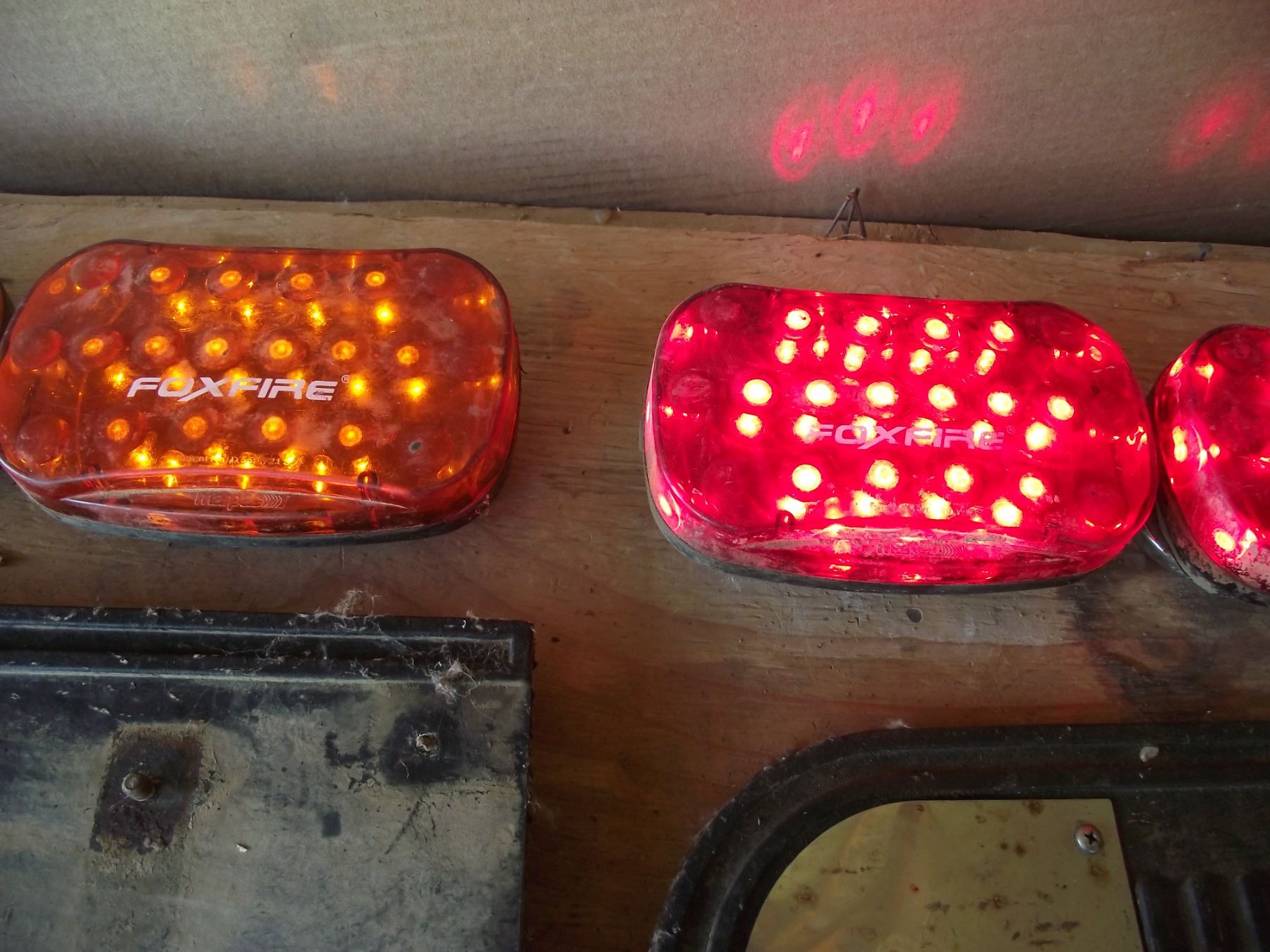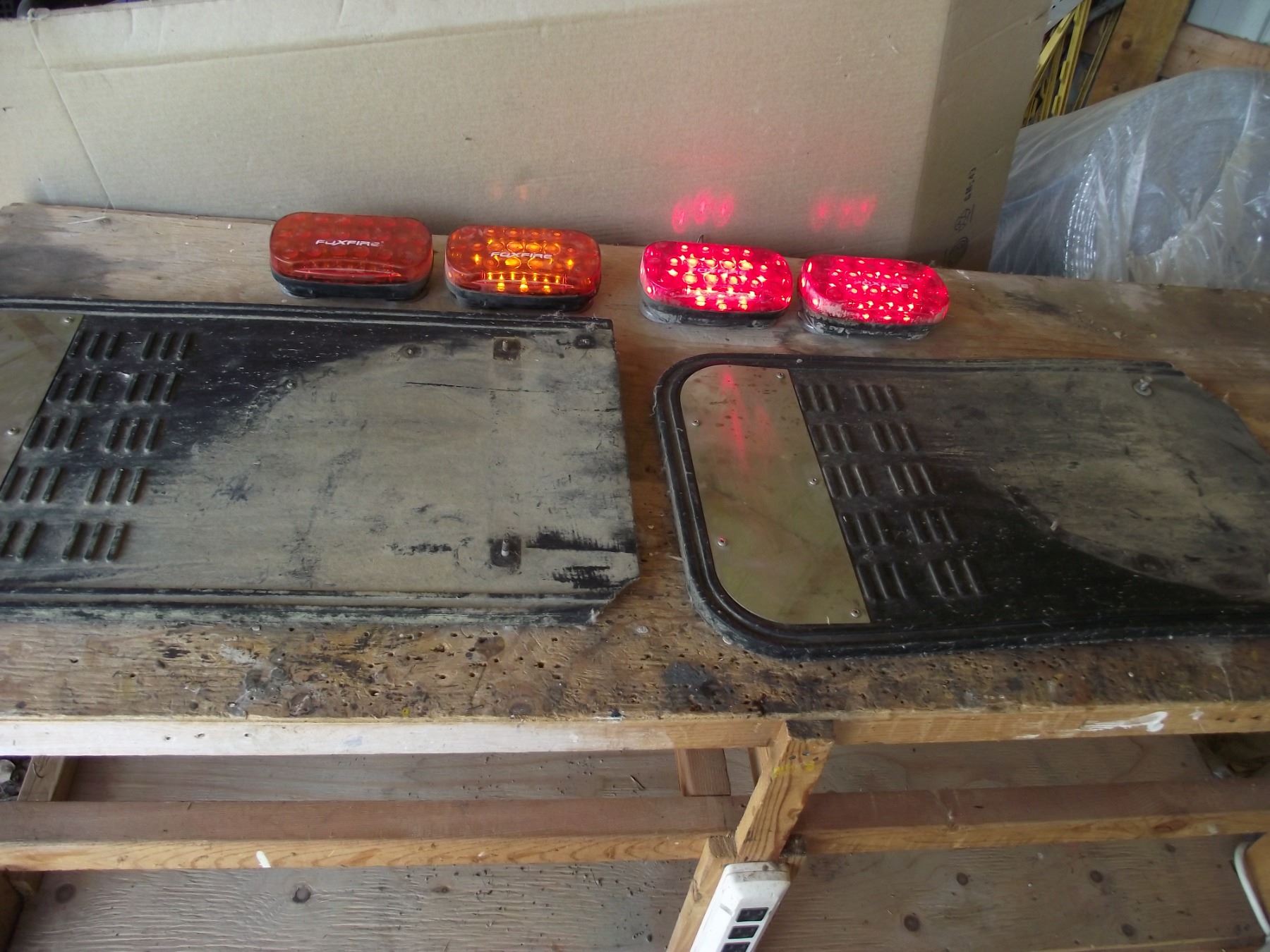 2-Mud Flaps used from a 90s model Chev Pickup, 4-Magnetic battery opperated emergency lights.