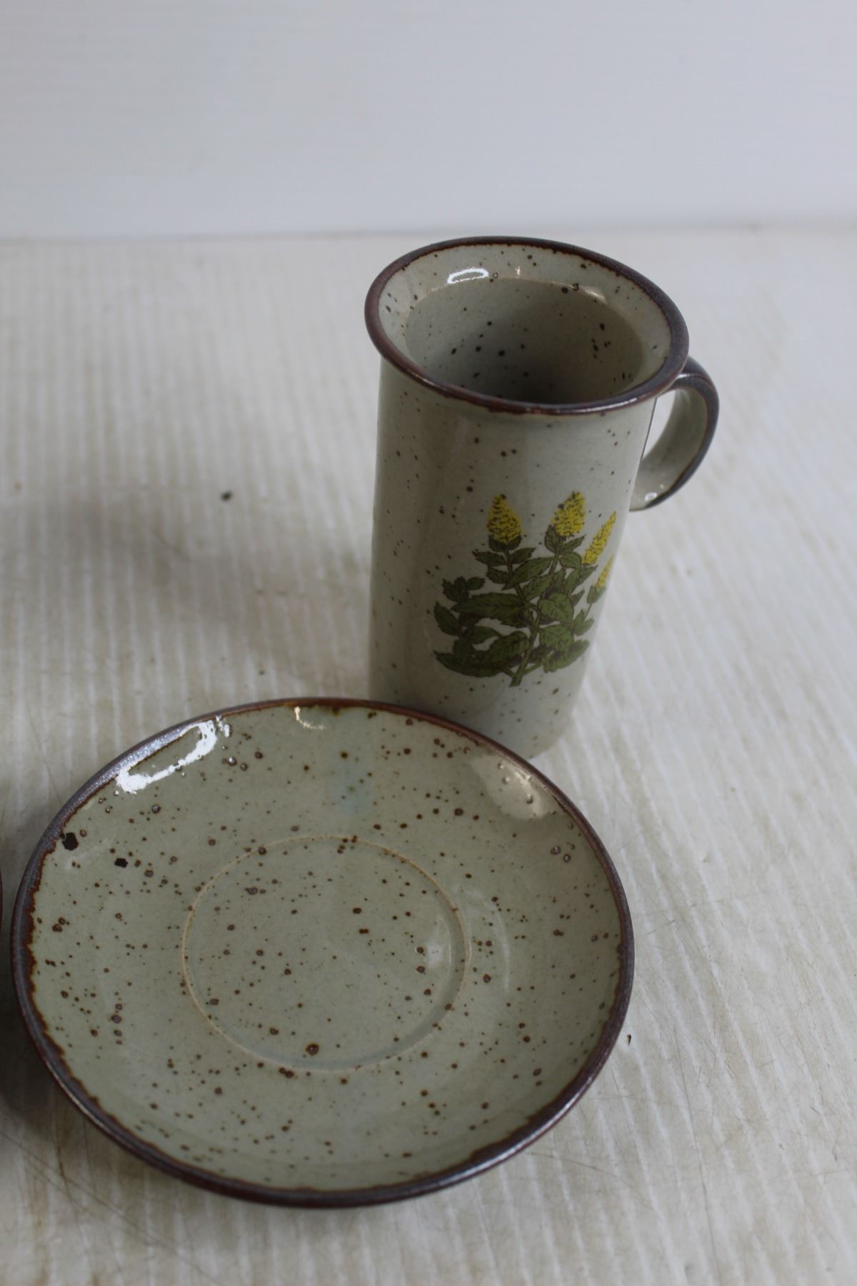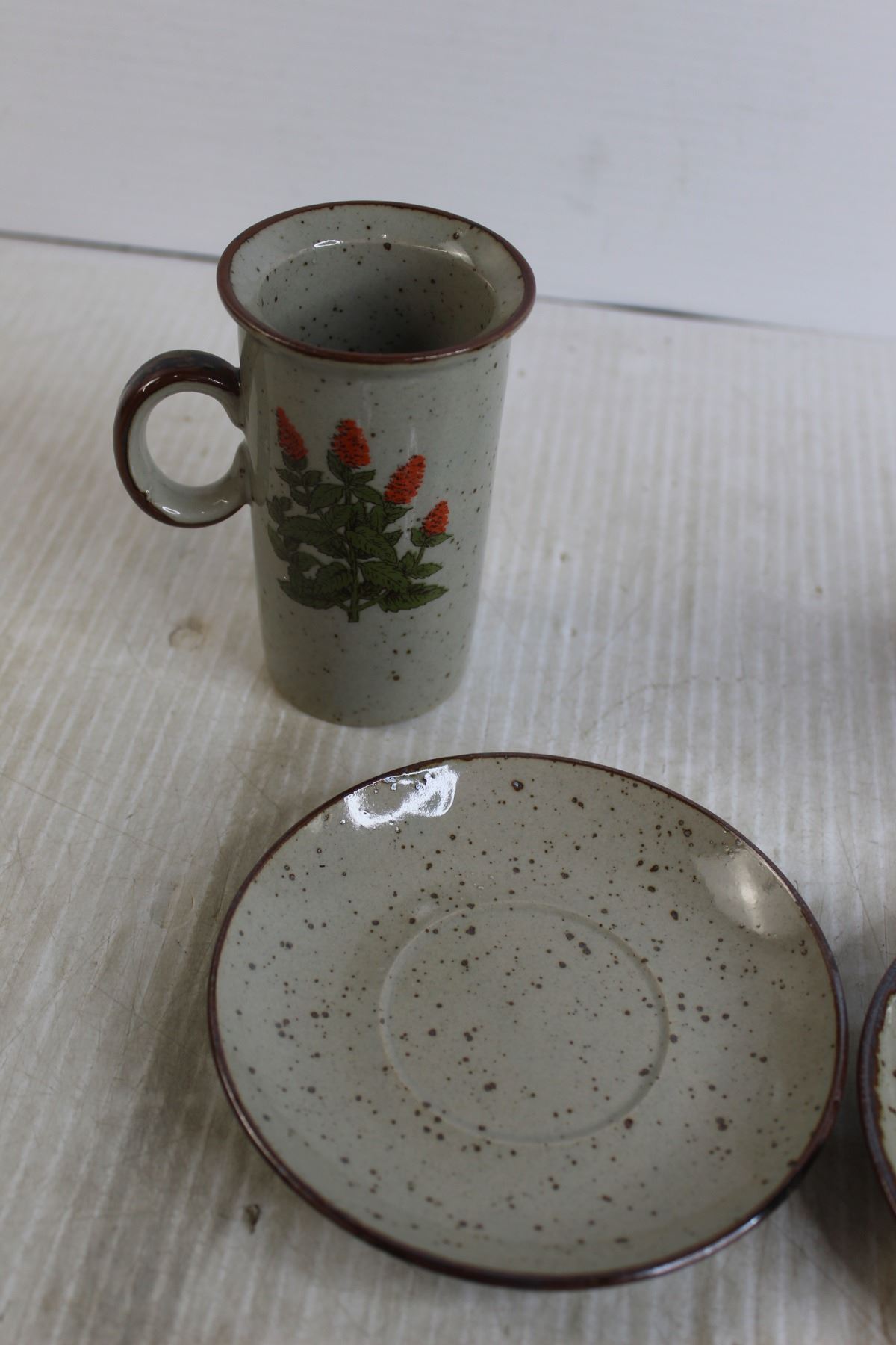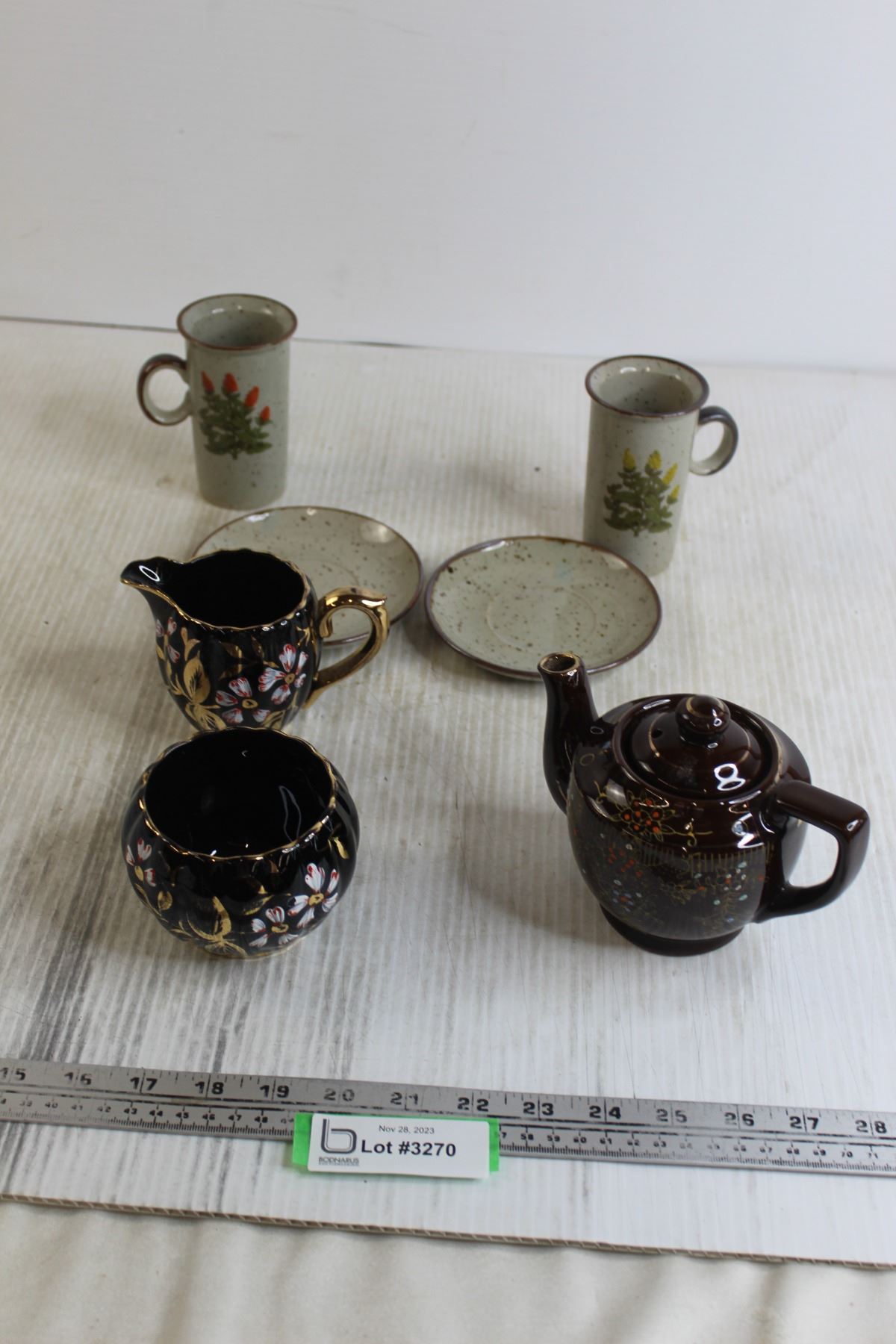 (2) Mugs with Matching Saucers, Matching Cream and Sugar, Teapot