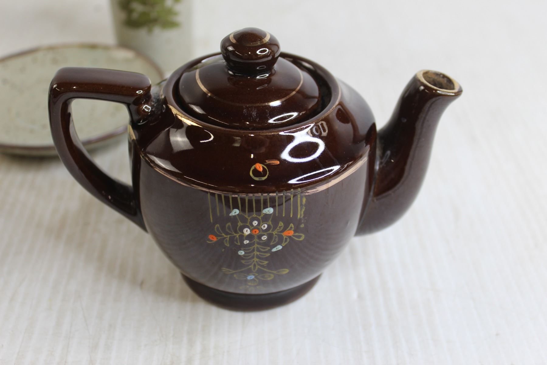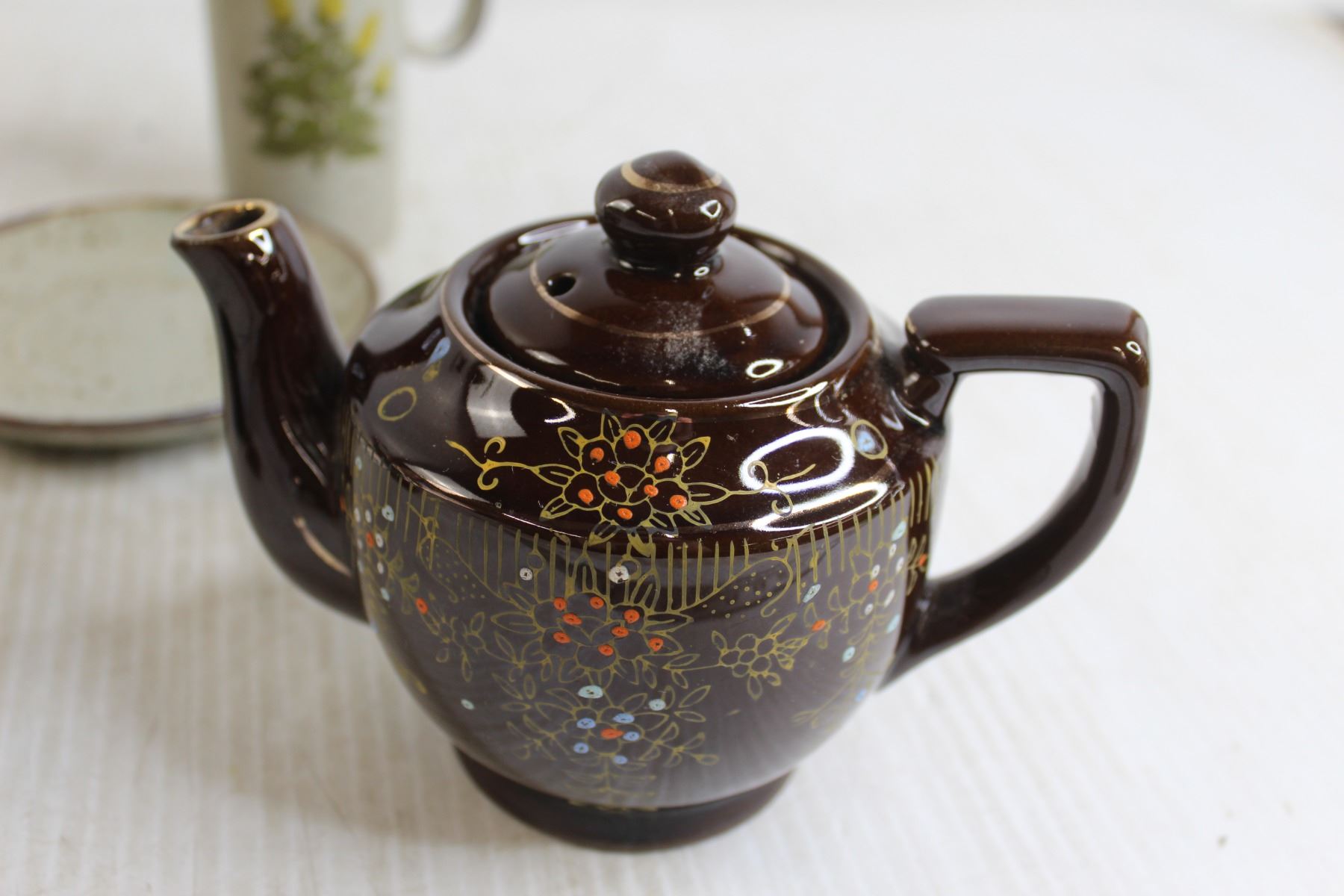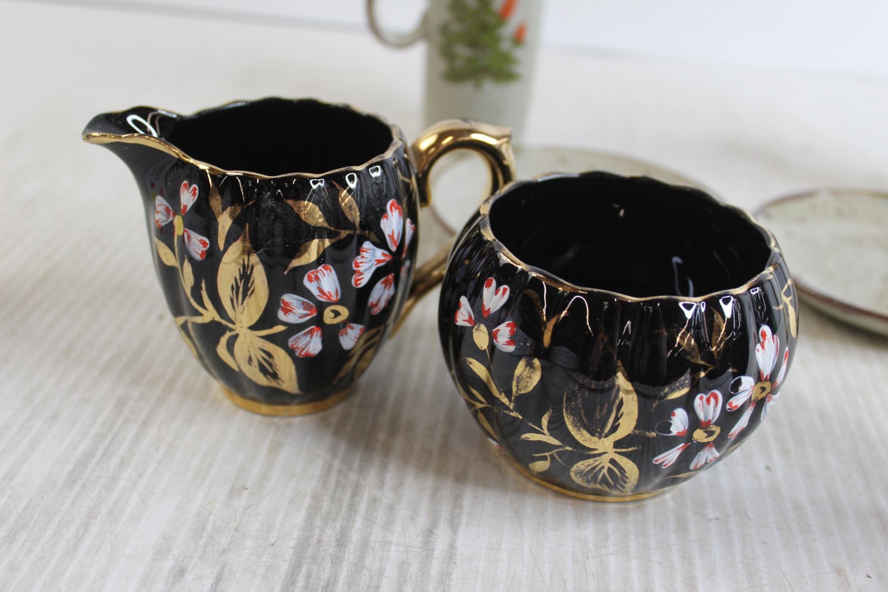 (2) Mugs with Matching Saucers, Matching Cream and Sugar, Teapot