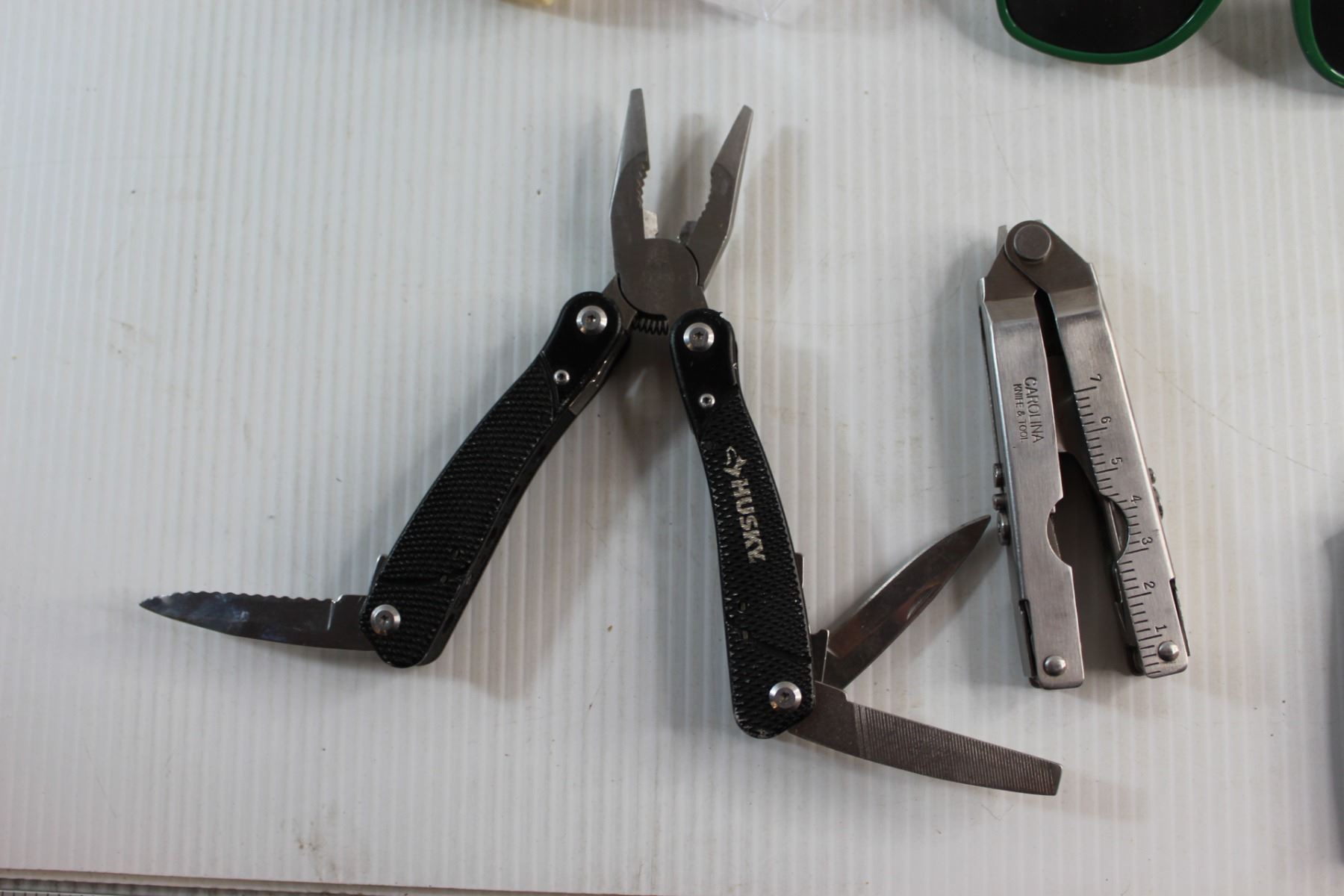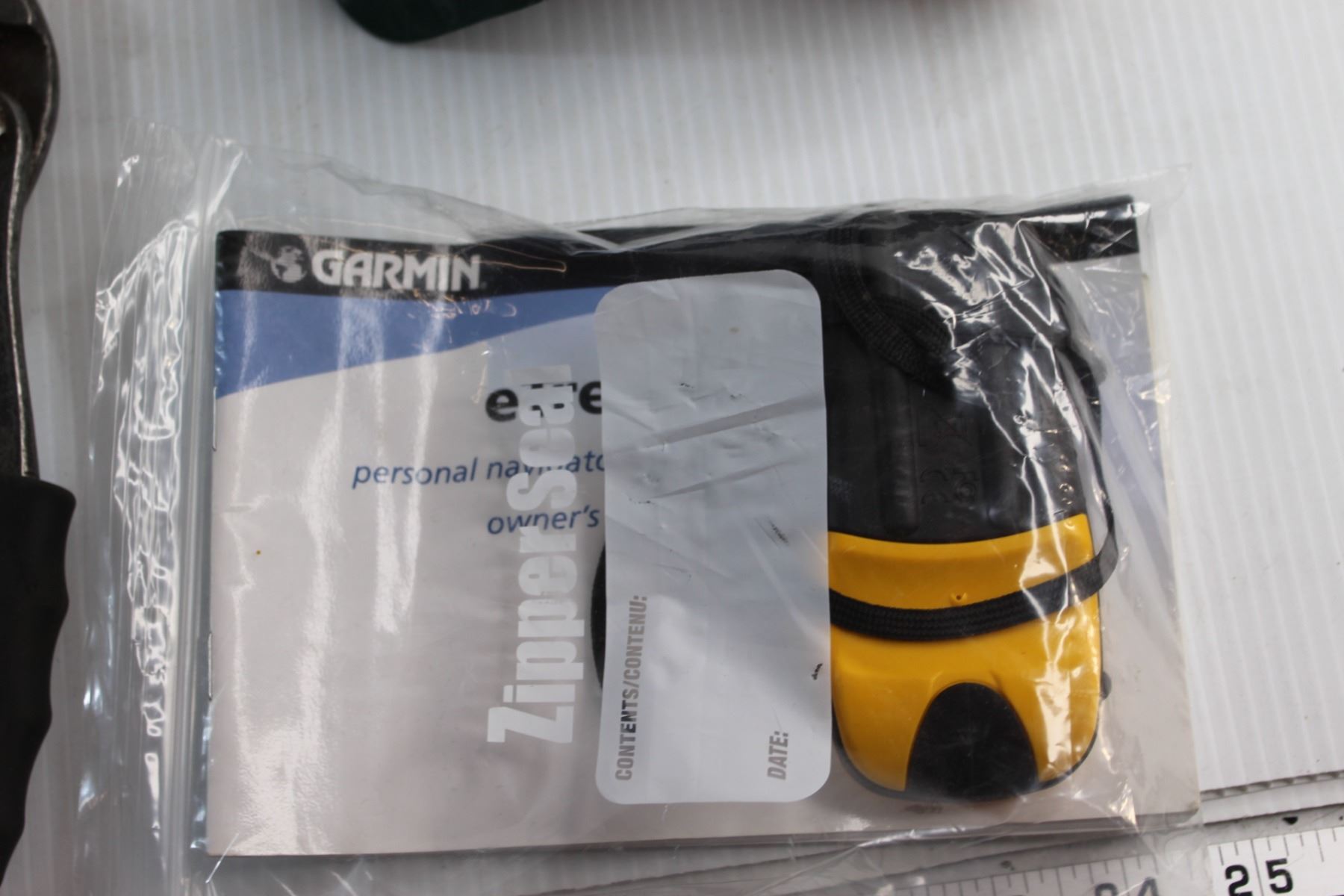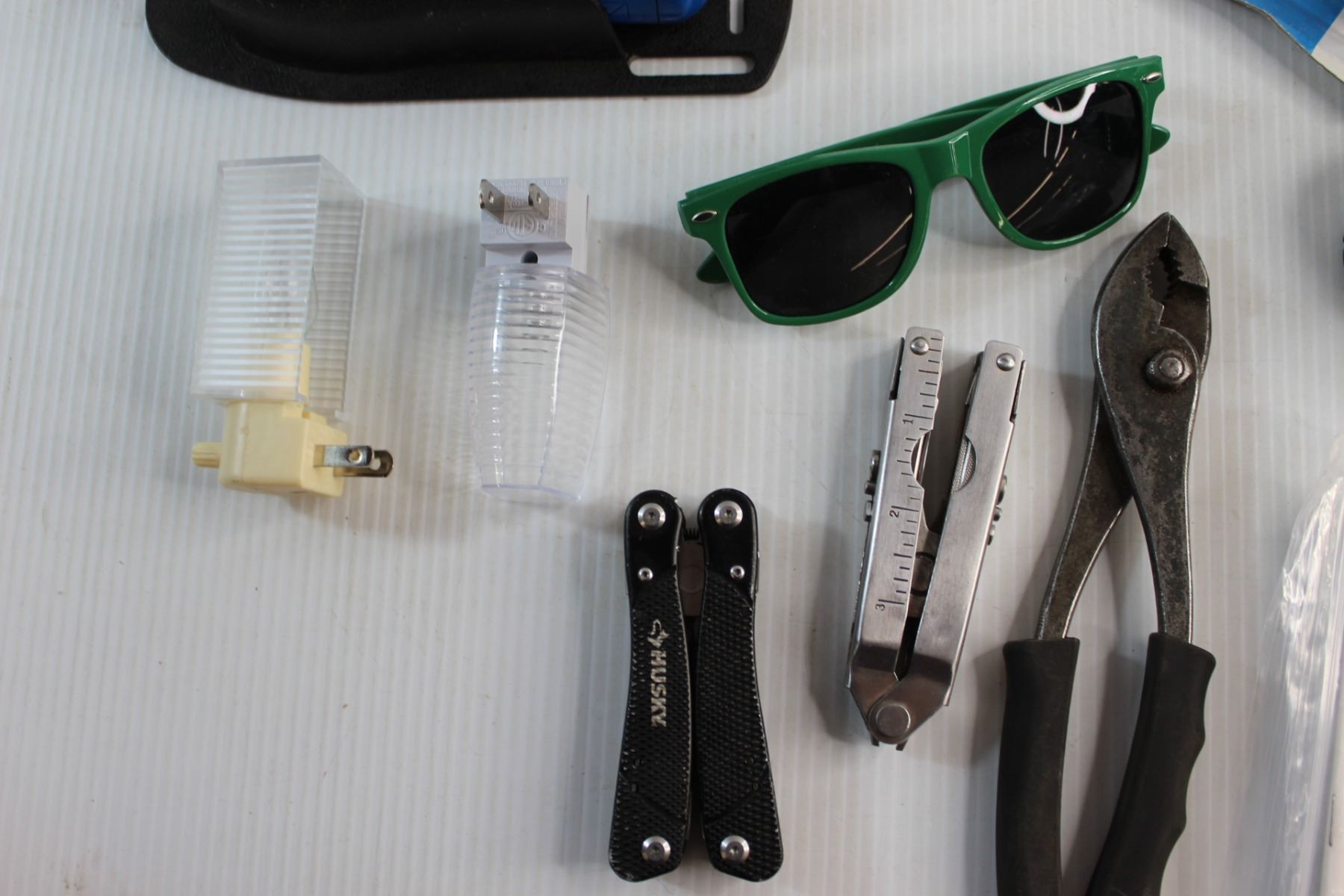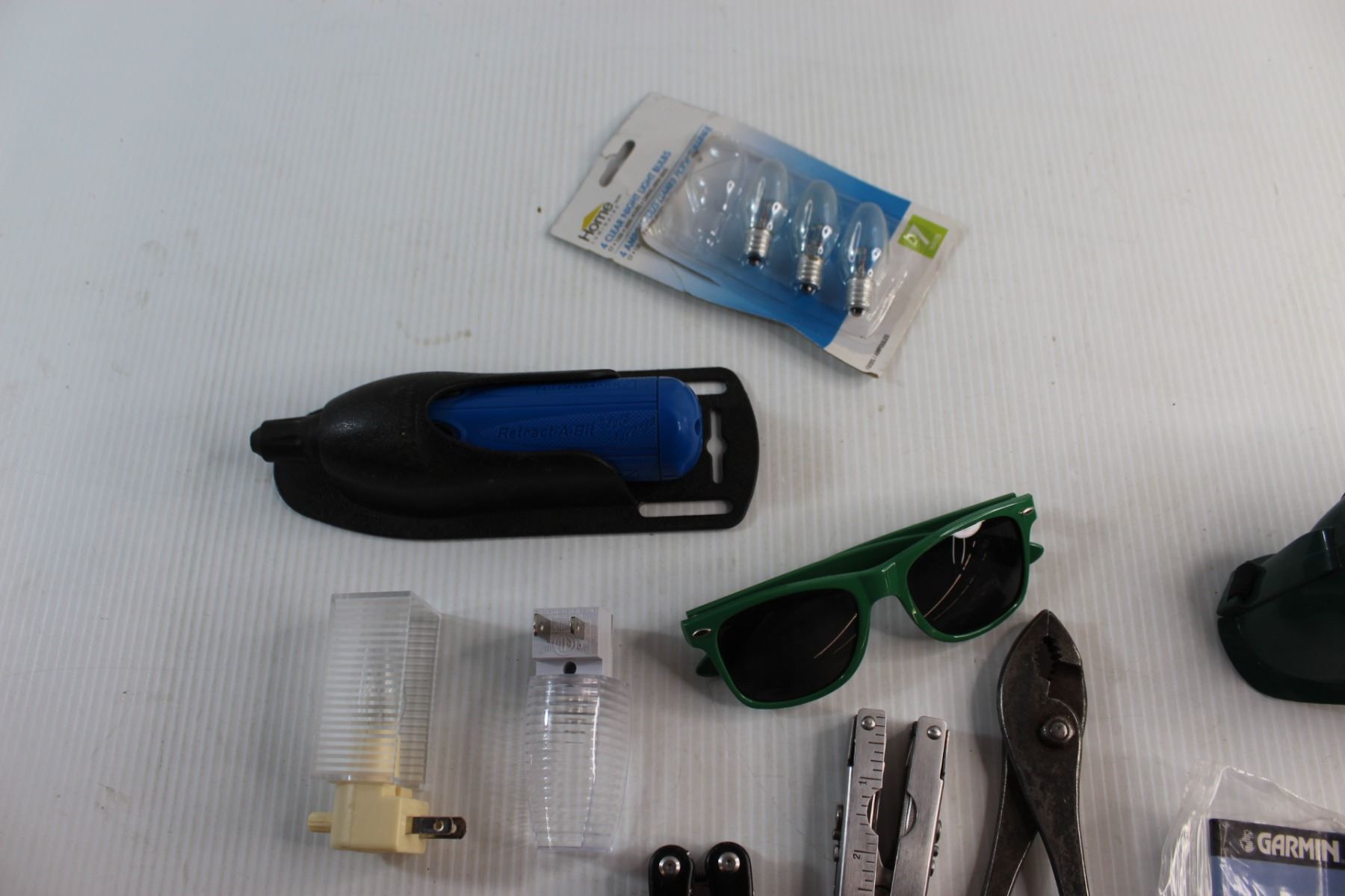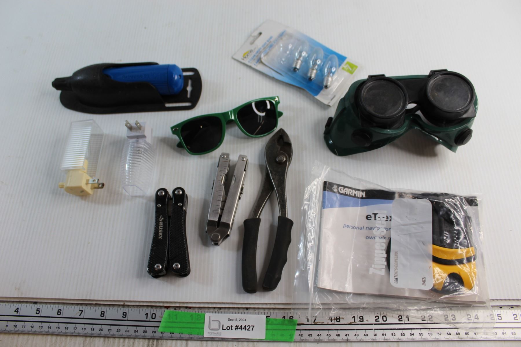(2) Multi Tools, Pliers, Welders Goggles, Garmin Navigator, Benchmark Retract-A-Bit and Assorted Items