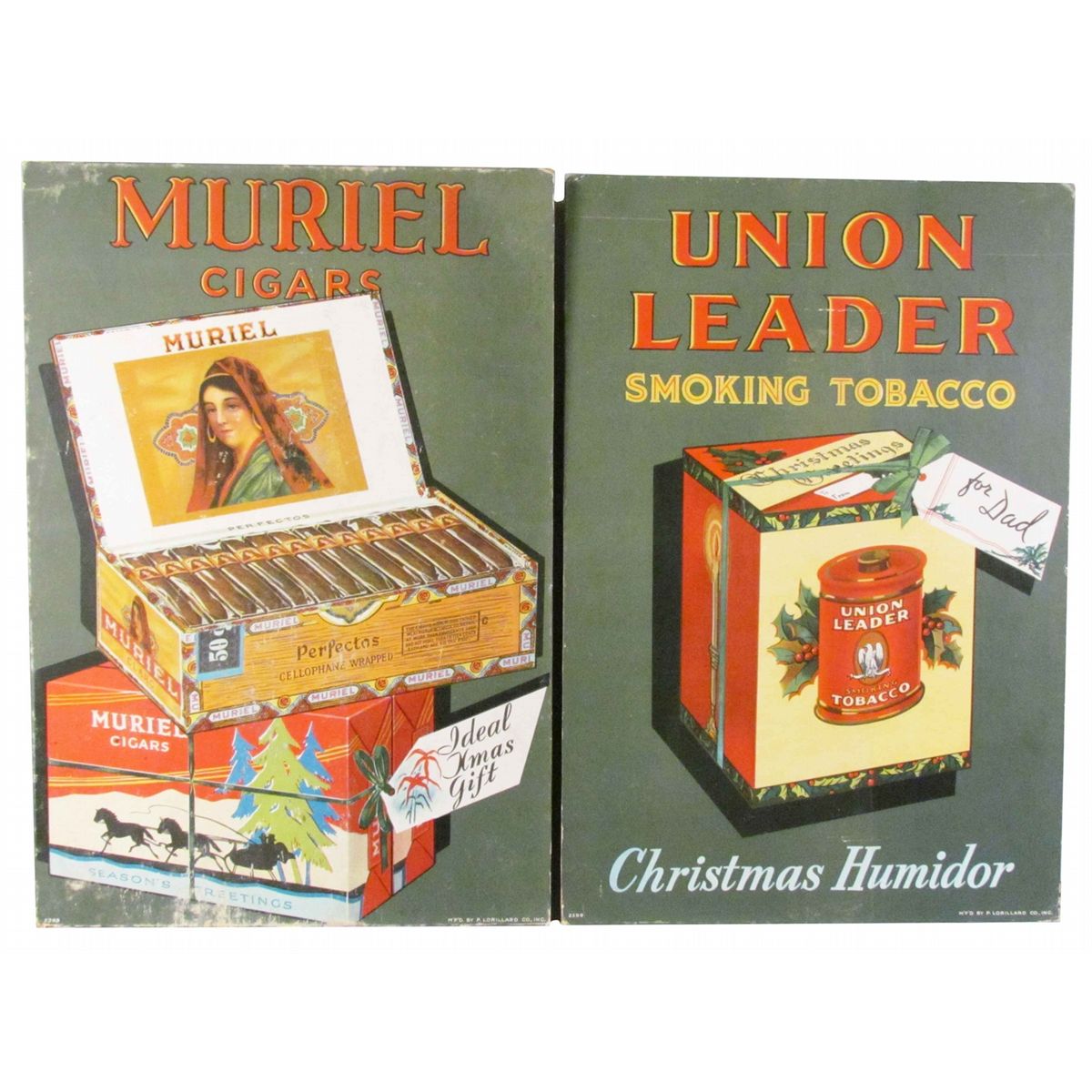 2 Muriel Cigars Cardboard Easel Back Holiday Signs. One shows wear around perimeter the other excellent condition. Each measures 13 X 19 inches.