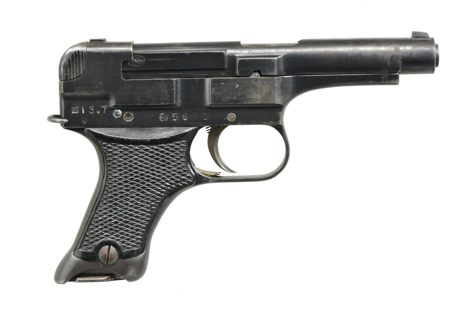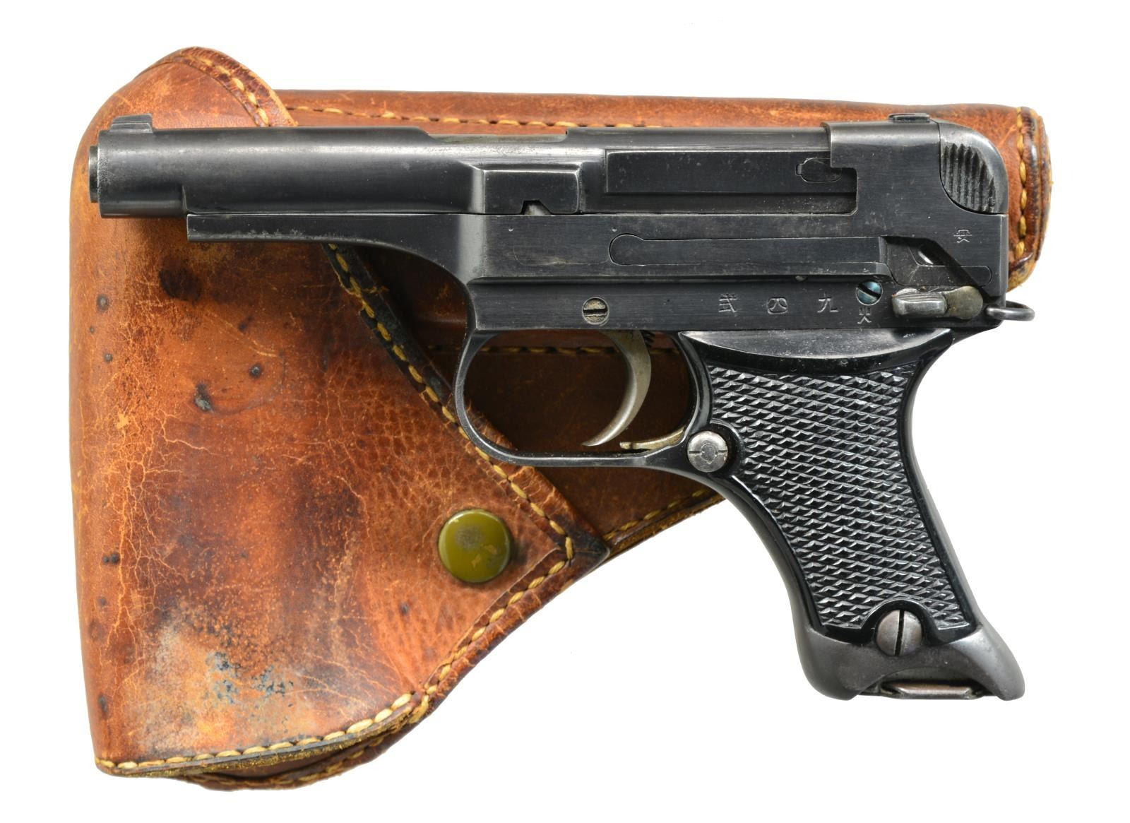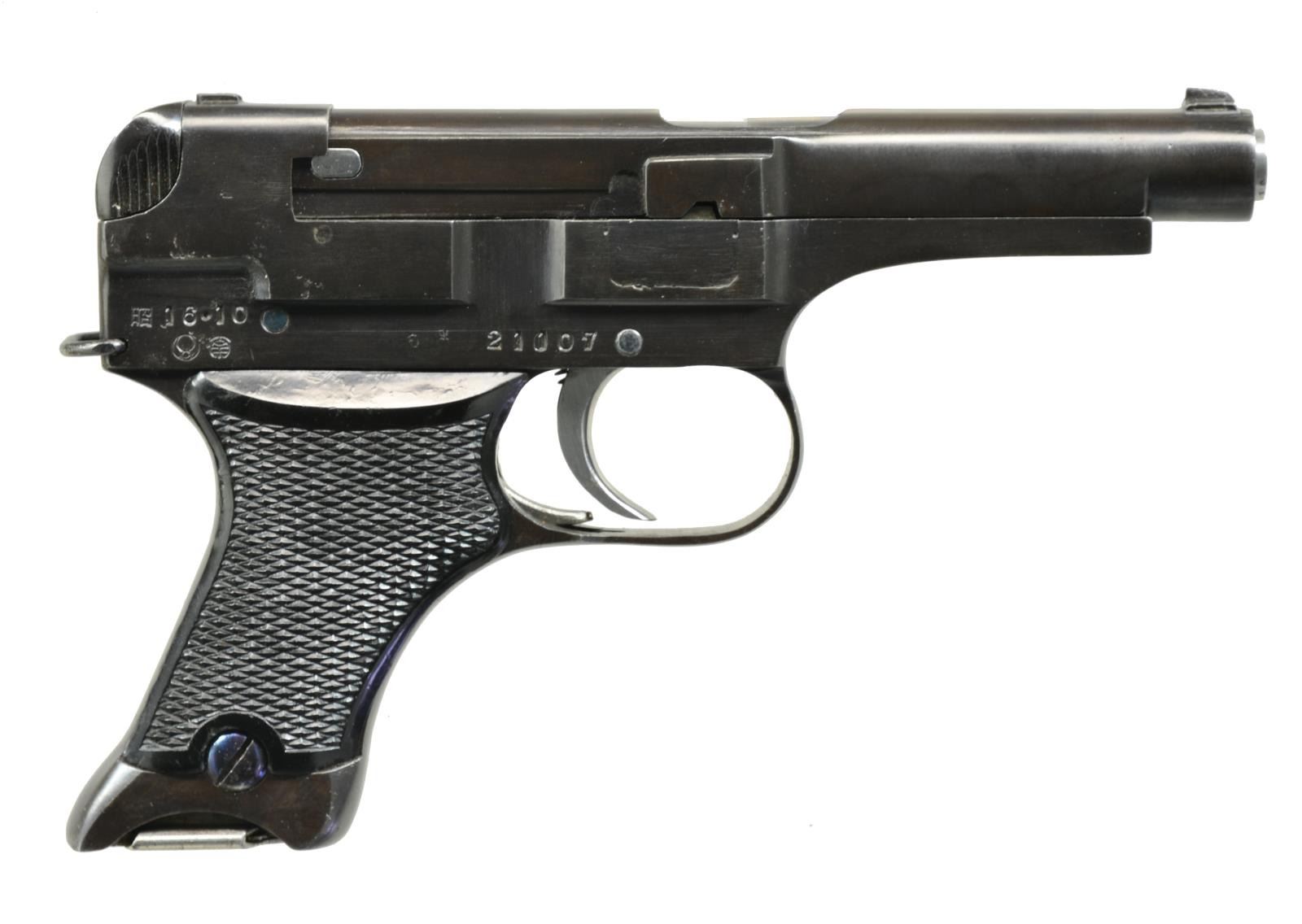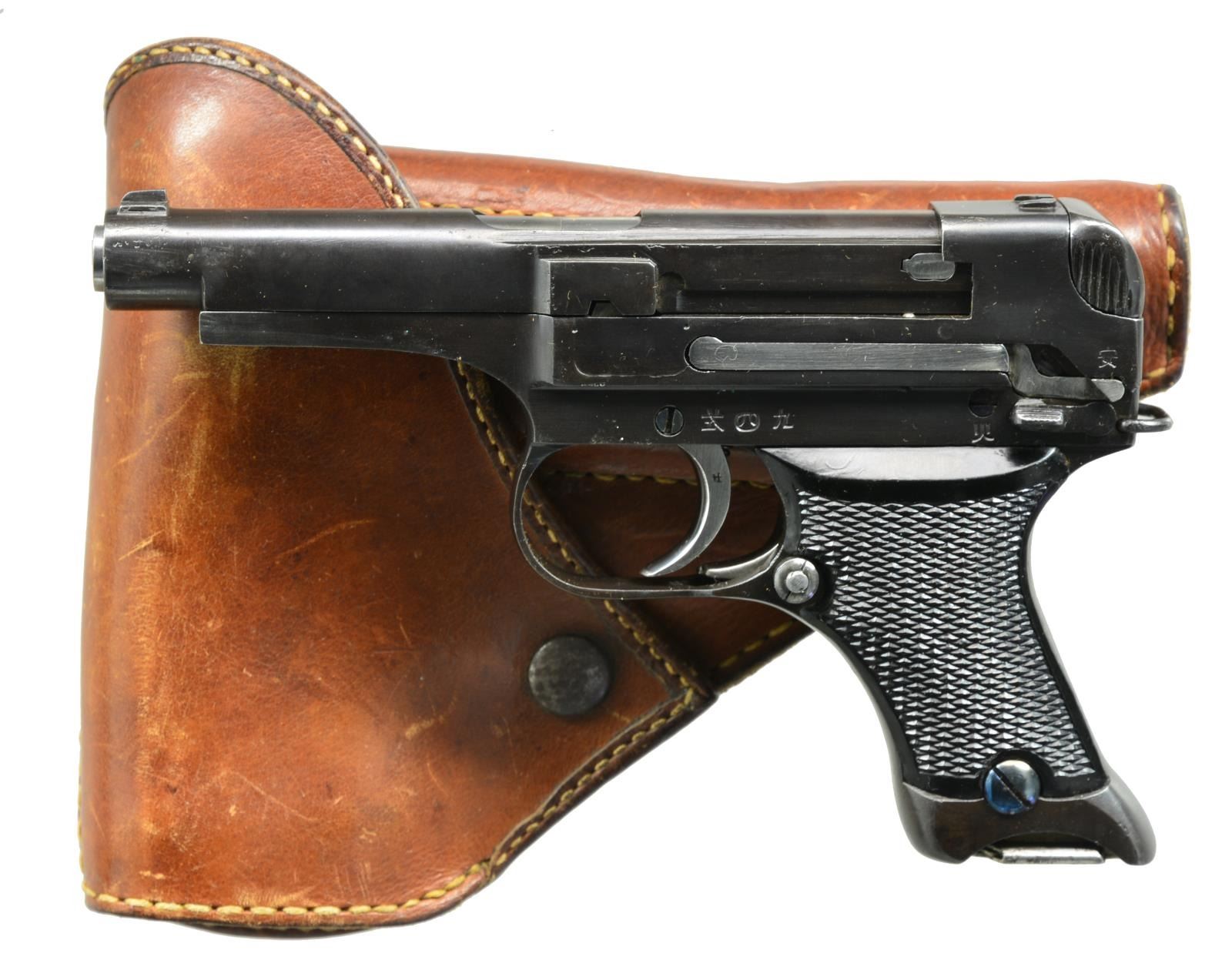 BOTH: cal. 8mm Nambu. Bbl. 3.8". Mfg. 1935-1945; approx. 70,000 units. Blued w/ Bakelite checkered grips. MAGS: 2 good plated 6 rd.; #673 w/ patina on base & much of spine, replacement loading button w/out serrations; & #107 some staining on body & edges of floorplate but better condition than previous; correct loading button. UNATTACHED ACCESSORIES: 2 brown flap holsters w/ button snaps & spare mag. pouches. Single wide belt loops & 2 steel "D" rings for shoulder straps, 1 appears very good; other has staining on front. 1) S# 5673. Mfg. July 1938. Blued finish except for strawed safety lever & matching no. trigger. CONDITION: very good to near excellent general appearance w/ arsenal quality refinish over light pitting. Patina in grip area. Stained appearance to most of bbl. exterior. Light high point holster & function wear. Very good grips. Good plus bore w/ areas of cleaned light oxidation. (20-2170/NW). 2) S# 21107. Mfg. Oct. 1941. Blued finish except for in the white trigger, transfer bar & bolt cross pin. CONDITION: very good general appearance w/ arsenal quality refinish over light pitting. Very good in the white bbl. exterior. Occasional faint prior pitting spots. Near excellent grips & fire blued screws. Good to very good bore w/ areas of cleaned light oxidation. (20-2171/NW). BOTH CURIO. $1,000-1,500.