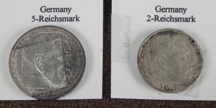 2 NAZI SILVER COINS-2 & 5 REICHSMARKS-1936 & 38--ENGRAVED EDGING * NICE CONDITION NAZI SILVER COINS *