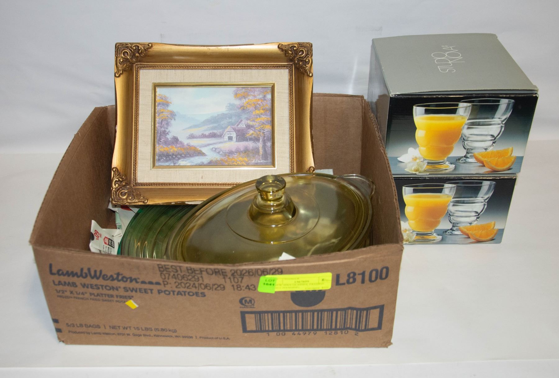 2 NEW 4PKS GLASSES, FRAMED WALL HANGING,