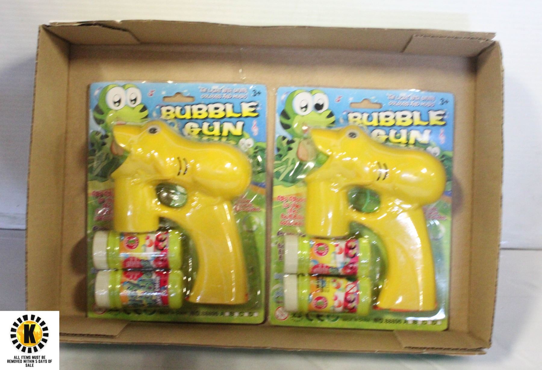 2 NEW BUBBLE GUN TOYS W/ COLOURED LIGHTS & MUSIC EACH W/ 2 BOTTLES/ BUBBLES