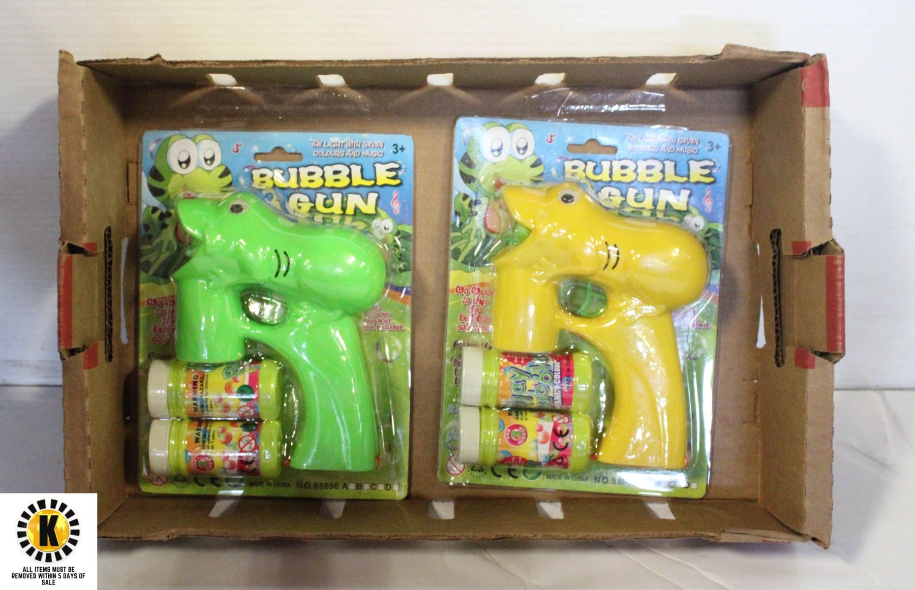 2 NEW BUBBLE GUN TOYS W/ COLOURED LIGHTS & MUSIC EACH W/ 2 BOTTLES/ BUBBLES