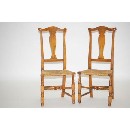 (2) NEW ENGLAND CHIPPENDALE SIDE CHAIRS - GOOD PR. COUNTRY CHIPPENDALE SPOONED BACK CHAIRS W/ CARVED EARS & VASE SPLATS, OLD RUSH SEATS, BLOCK & RING TURNED LEGS & WELL TURNED FRONT STRETCHER (41"T X 19"W X 18"D) - WEAR, REPAIRS, IMPERFECTIONS