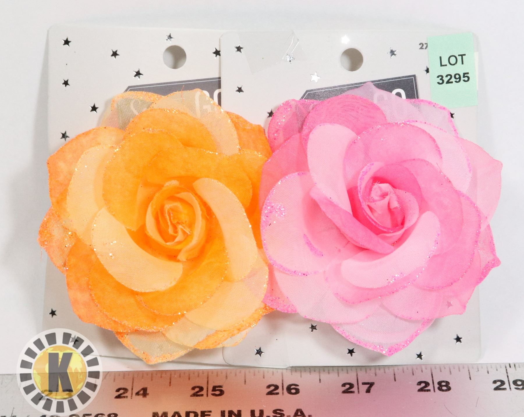 2 NEW FAUX ROSE ELASTICS/CLIPS PINK AND ORANGE