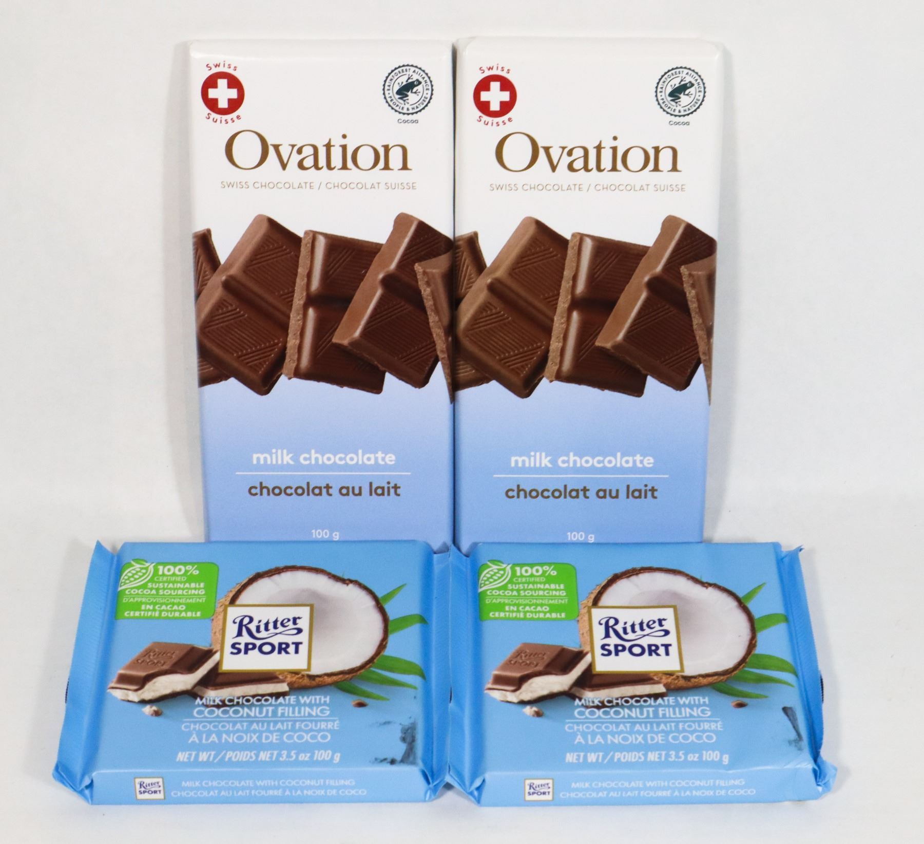 FILLING CHOCOLATE BARS 100G EACH BAR. BEST BEFORE DATE SEPTEMBER 22 2023. AND 2 NEW OVATION SWISS CHOCOLATE BARS BEST BEFORE DATE: SEPTEMBER 7 2023.