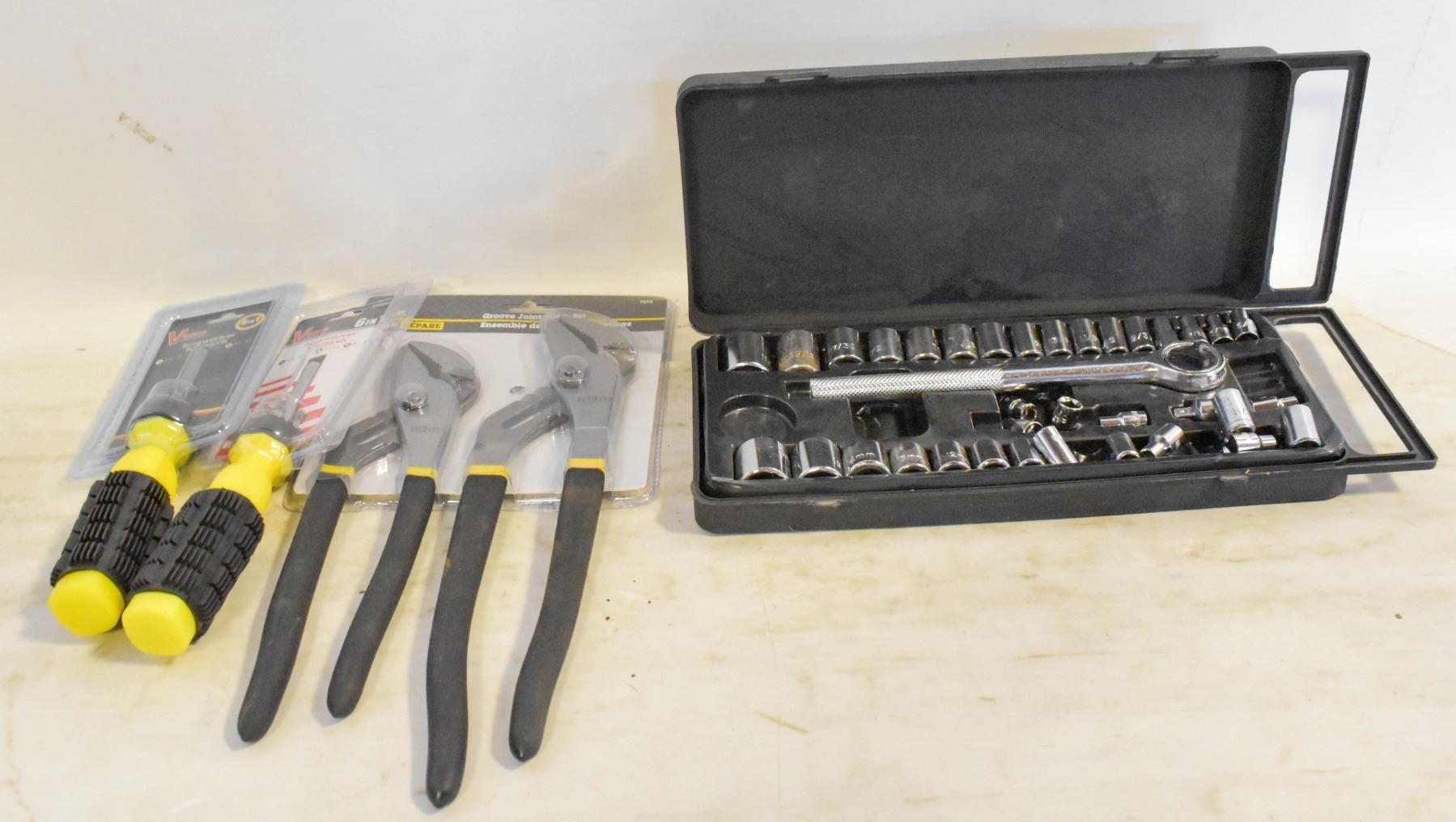 2 NEW SCREW DRIVERS, 2 NEW PLIERS AND