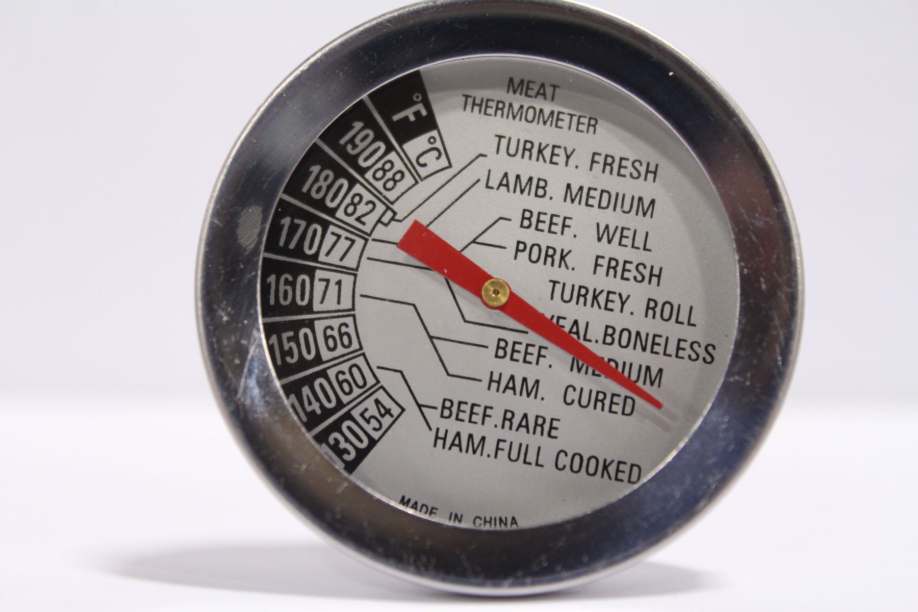 2 NEW IN PACKAGING STAINLESS STEEL DIAL / ANALOG THERMOMETERS. TURKEY, LAMB, BEEF, PORK, VEAL.