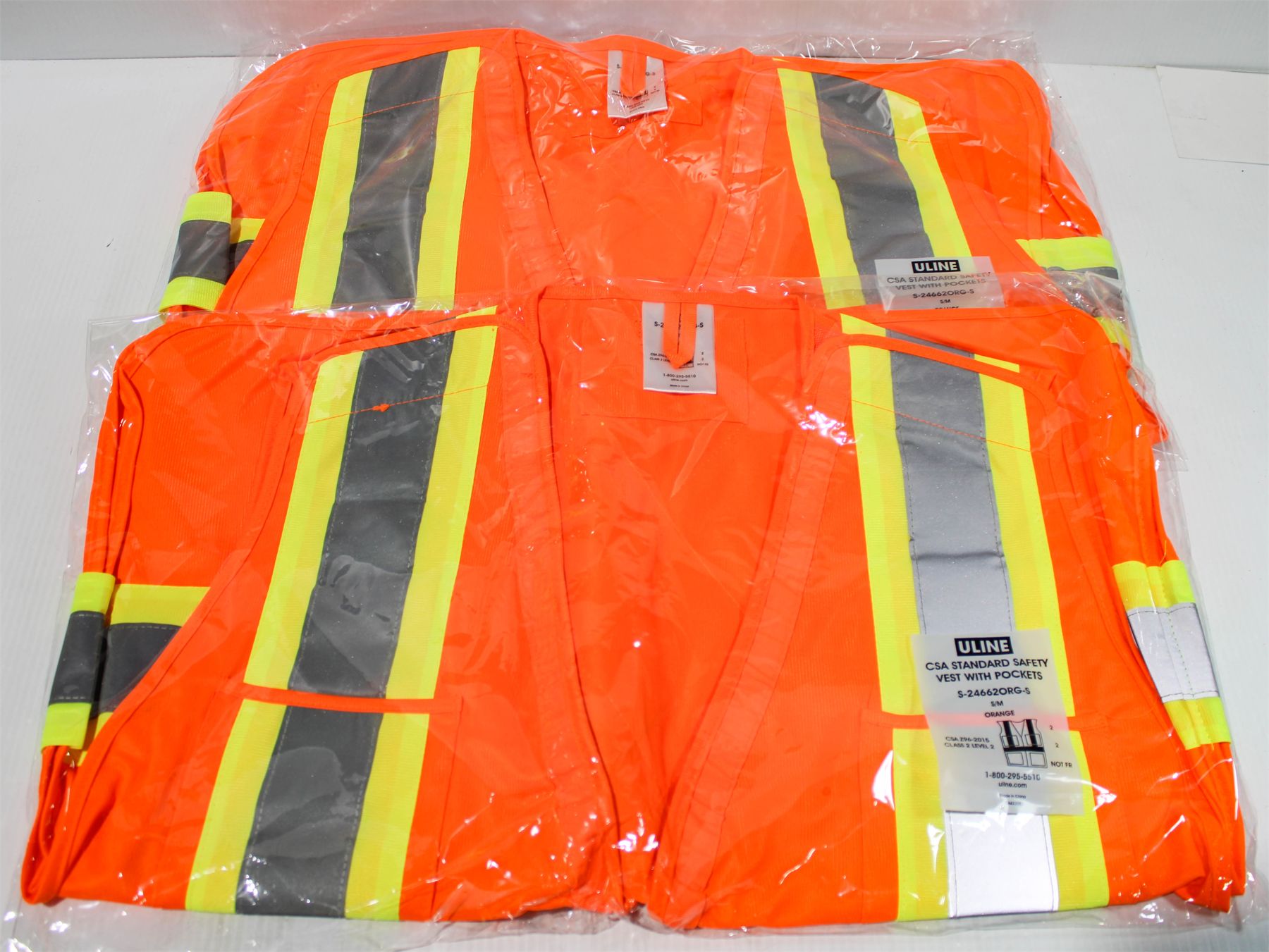 2 NEW ULINE CSA STANDARD SAFETY VESTS W/ POCKETS - SMALL