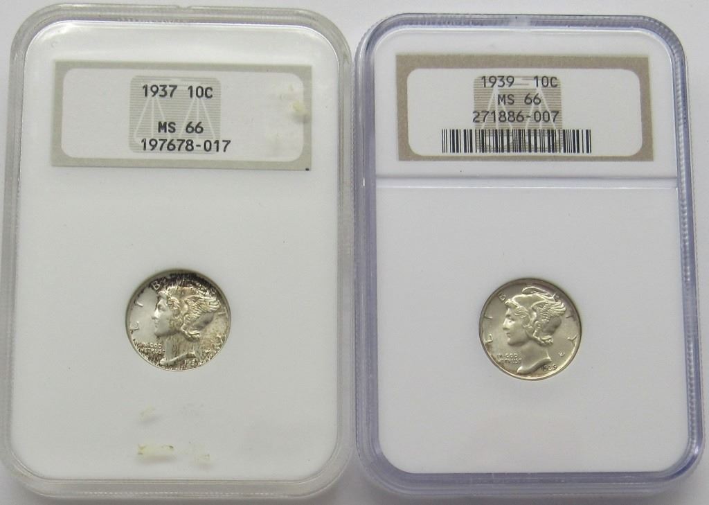 2-NGC Mercury Dimes 1937 MS66, 1939 MS66 10C