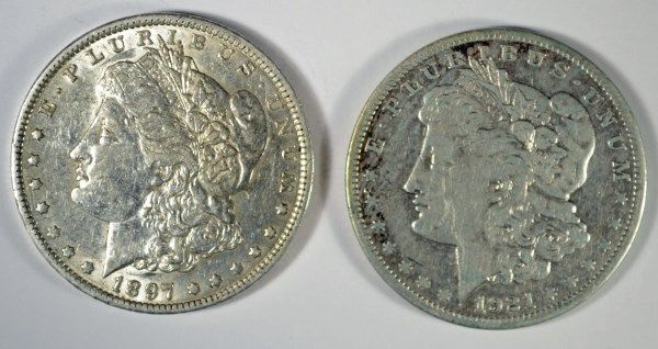 ( 2 ) NICE CIRCULATED MORGAN SILVER DOLLARS, 1897-O AND 1921-P
