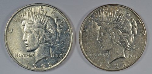 ( 2 ) NICE CIRCULATED PEACE SILVER DOLLAR, 1922-P AND 1923-S