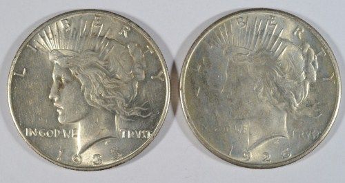 ( 2 ) NICE CIRCULATED PEACE SILVER DOLLARS, 1925-P AND 1935-P