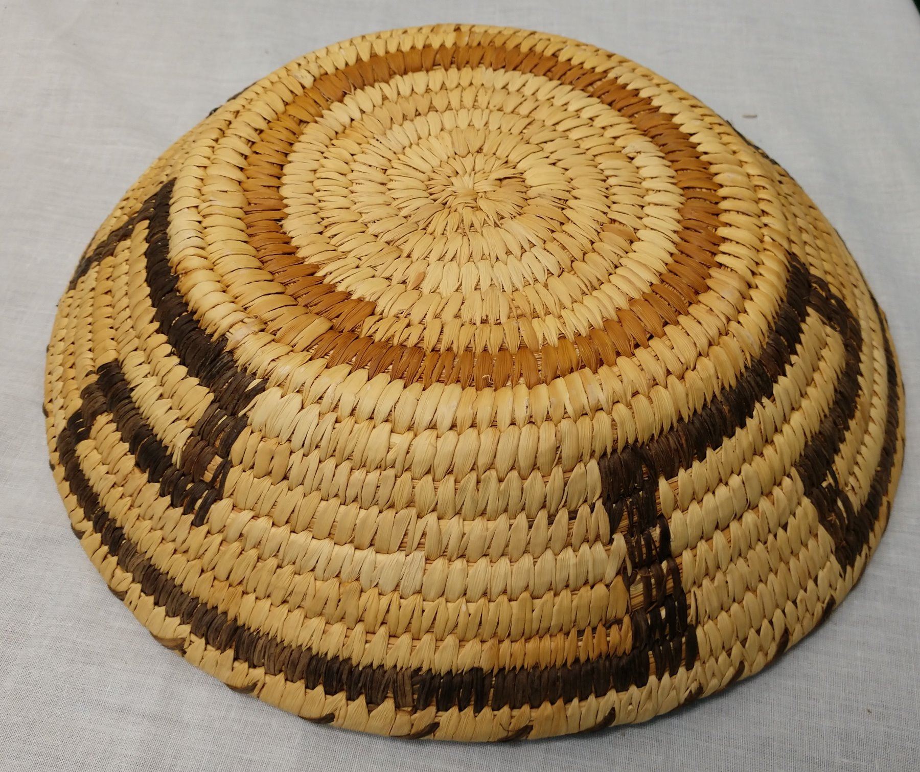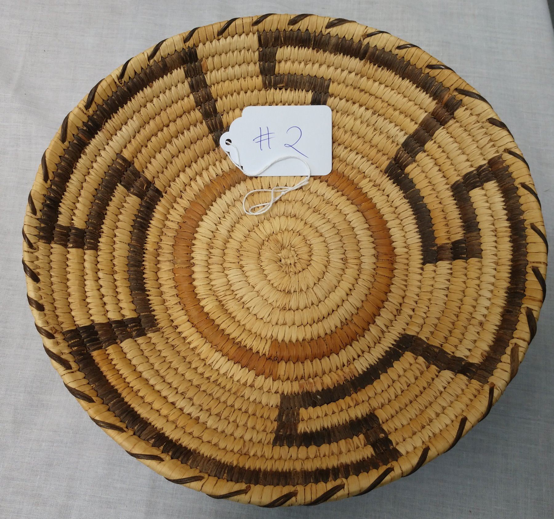 2 Native American Baskets, 20th century items. Made of yucca and devil's claw, the items measure 11" x 3" and 1 1/2" x 3/4". Larger is Papago from Arizona, smaller is a Pomo feathered gift basket from California. Condition: Good, see images. Shipping: $22.50 w/insurance and signature, due to value.