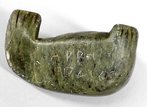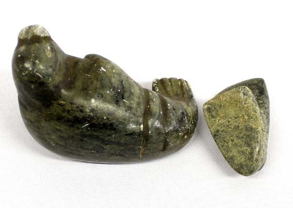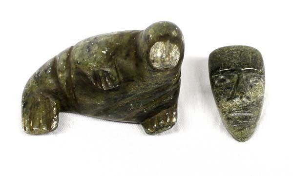 2 Native American Canadian Inuit Stone Carvings, 1. Native American Canadian Inuit Carved Stone Walrus, measures 3.5''L x 2.25''W x 2.25''H, signed in Roman with disc number 2. Northwest Coast Canadian Inuit Carved Stone Serpentine Maskette, measures 1.25'' x 2.5'', signed in Inuktitut, however canoot resolve the signature