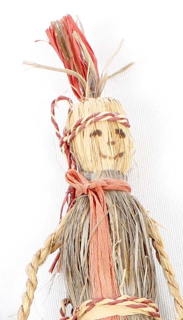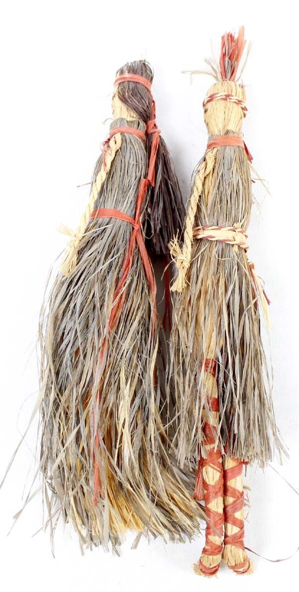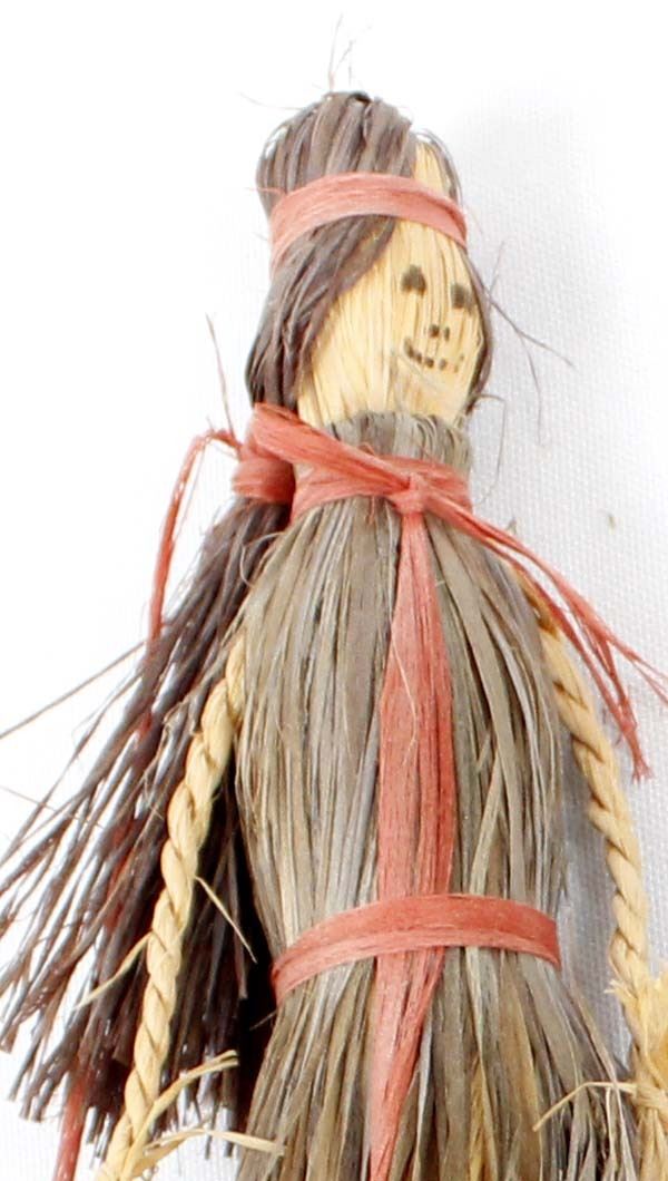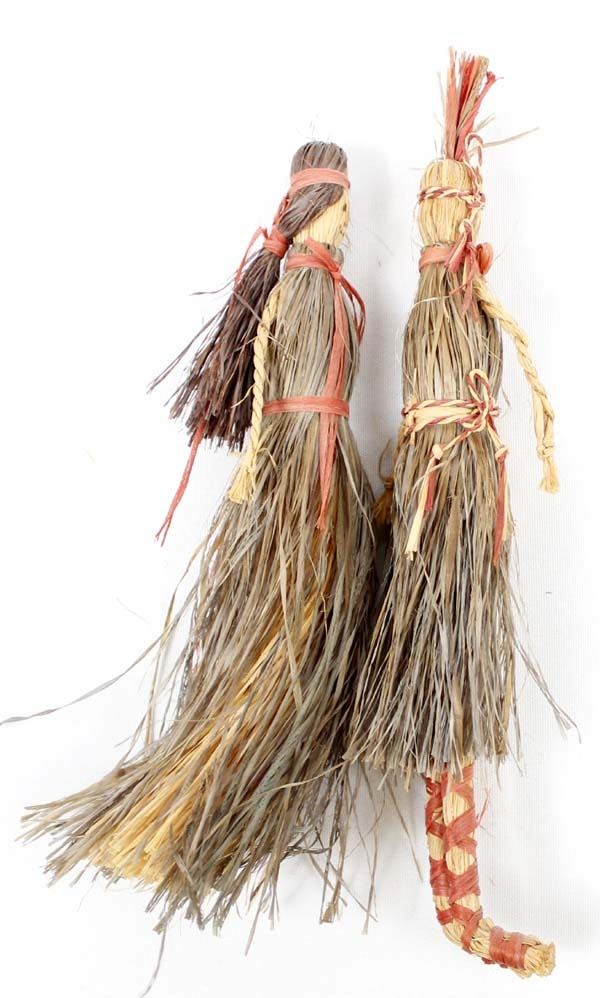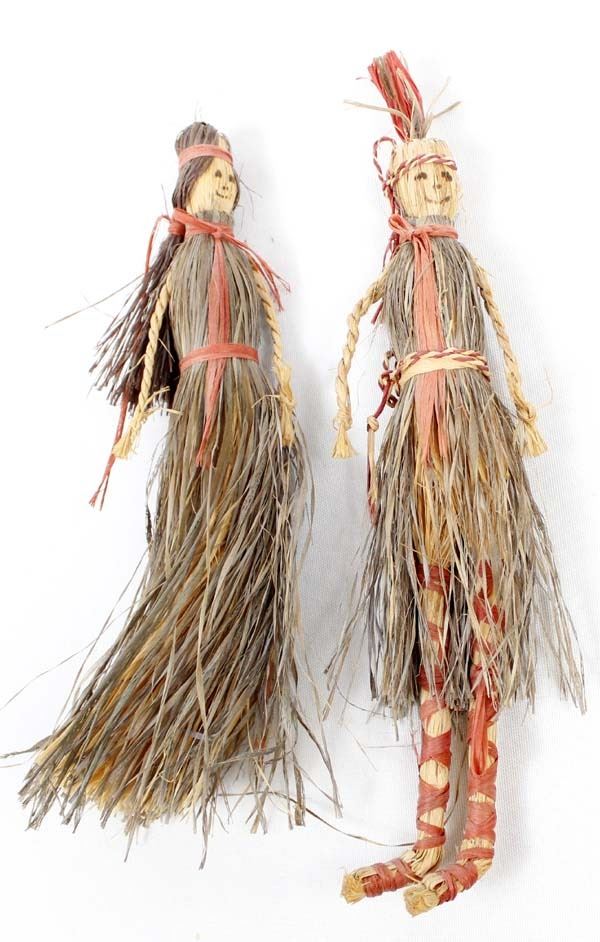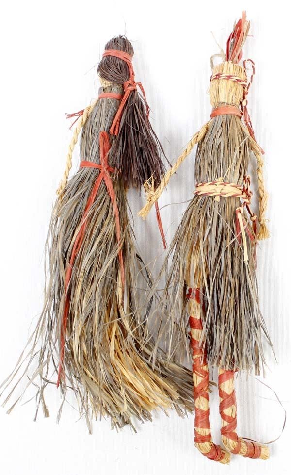2 Native American Cherokee Buffalo Grass Dolls, measure 1.5''W x 10''L, hand drawn faces, braided raffia arms, raffia legs on one of the dolls