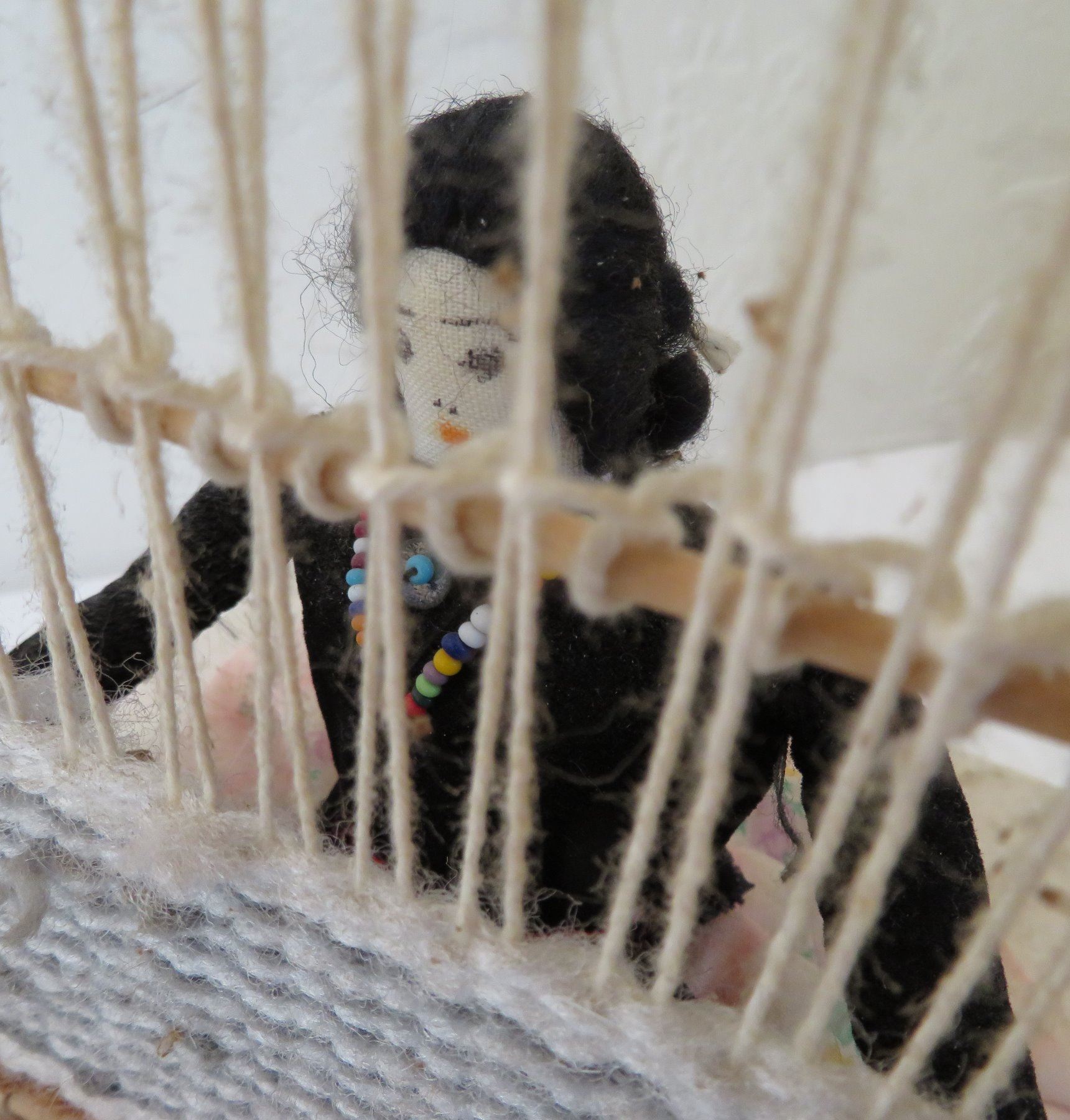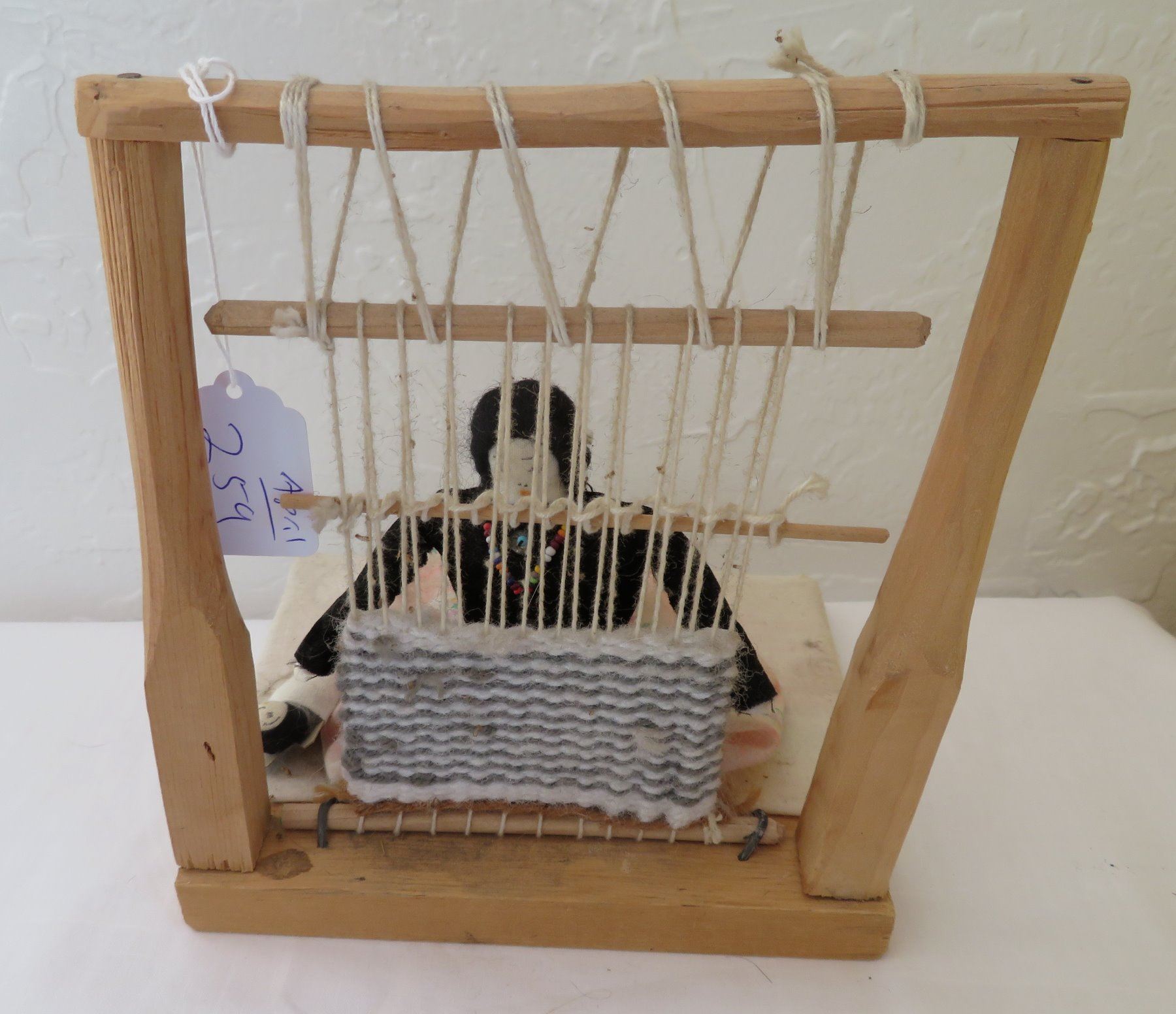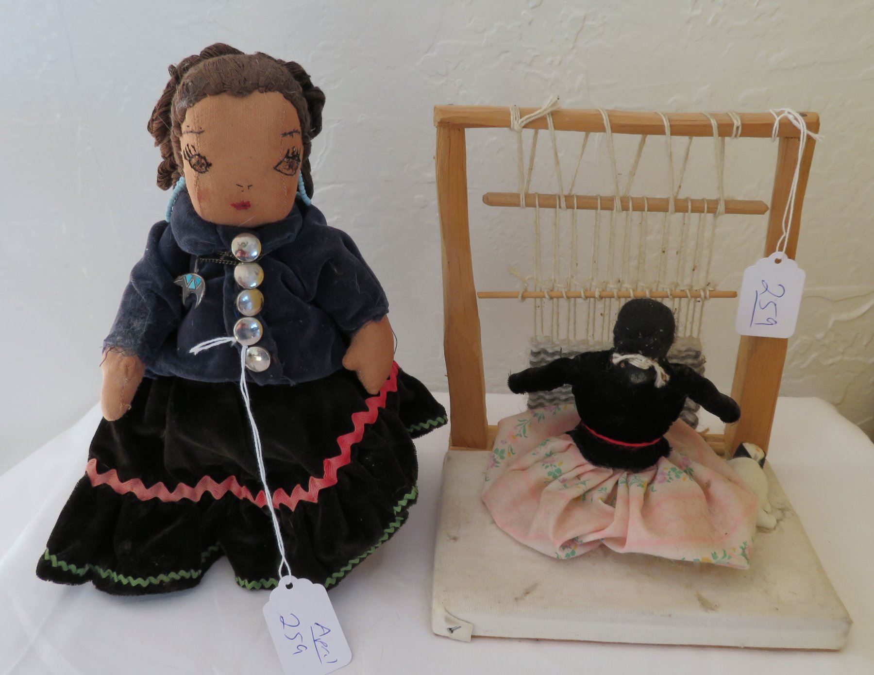 2 Native American Dolls, c. 1960s. Made of wood, glass beads, wool, cloth, sterling silver, turquoise and metal, the items measure 7" x 5 1/2" x 8 and 5" x 4 1/2" x 9". Navajo, New Mexico. Nice Navajo worker weaver doll with baby. Other doll even has a sterling and turquoise bear pendant and stand. Condition: Good, some wear, see images. Shipping: $25.50 w/insurance and signature.