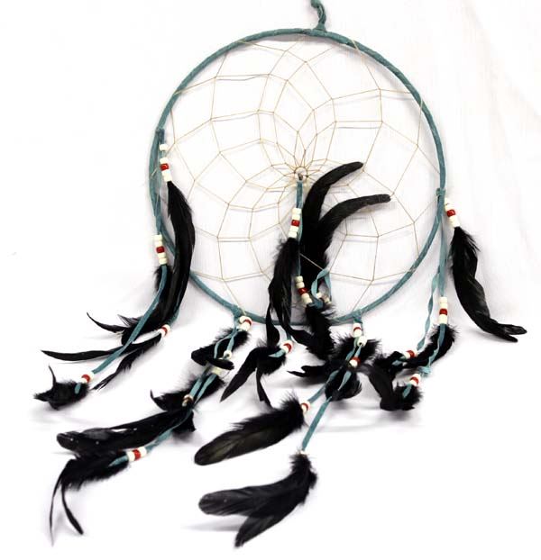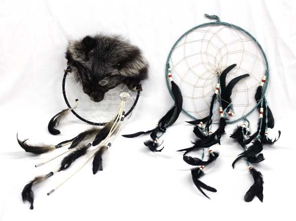 2 Native American Dream Catchers, 9'' and 12''D, both are suede wrapped and embellished with fur, feathers, and beads