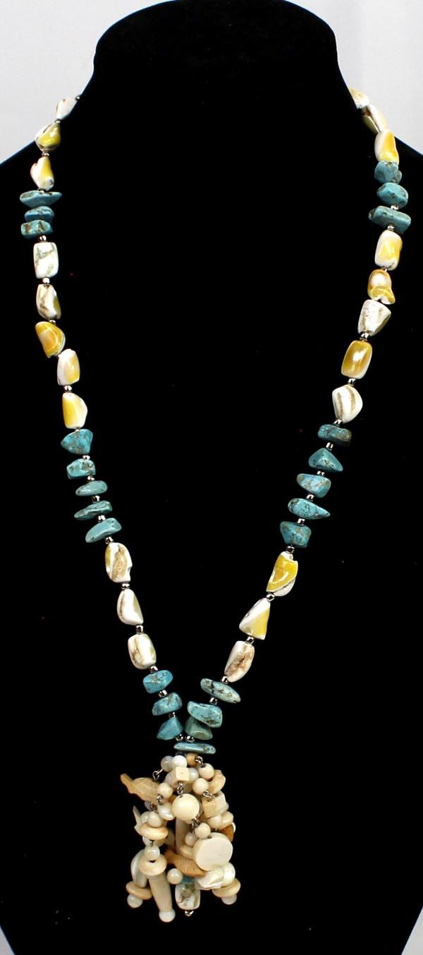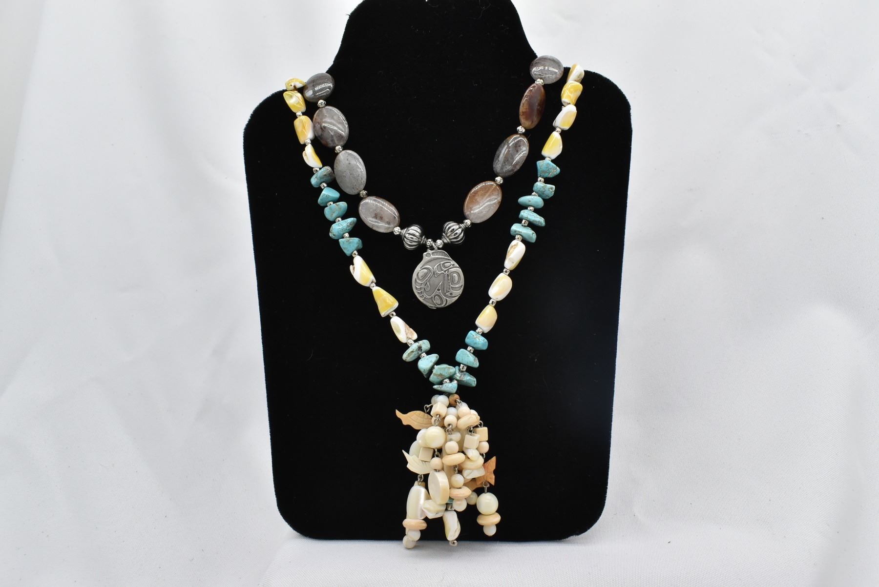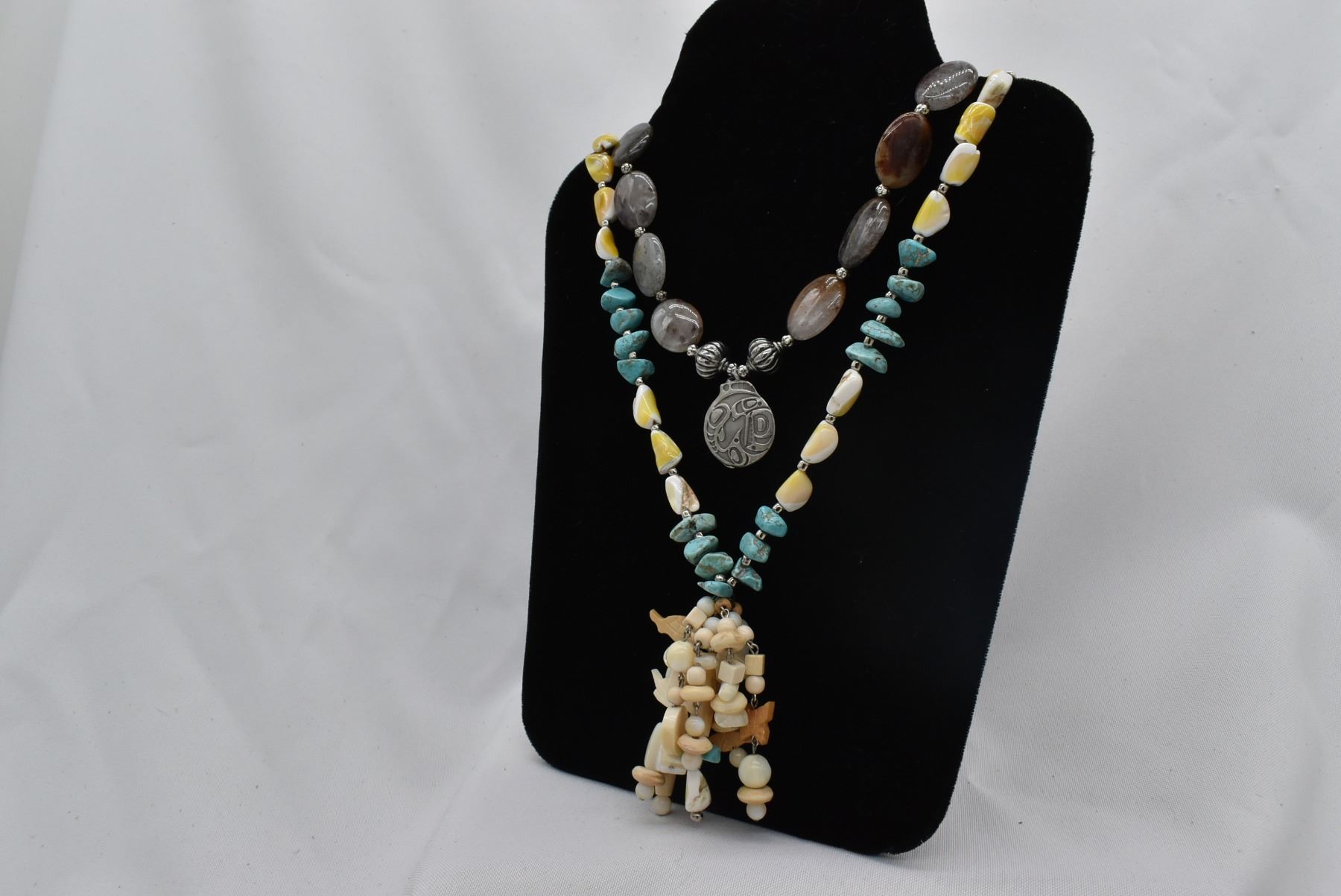 2 Native American Hand Crafted Necklaces by Kathy Kills Thunder. The Moss Agate Pendant Necklace Measures 20 " end to end while the Turquoise and Gold Lip Shell Bead Necklace measures 32" end to end