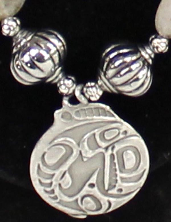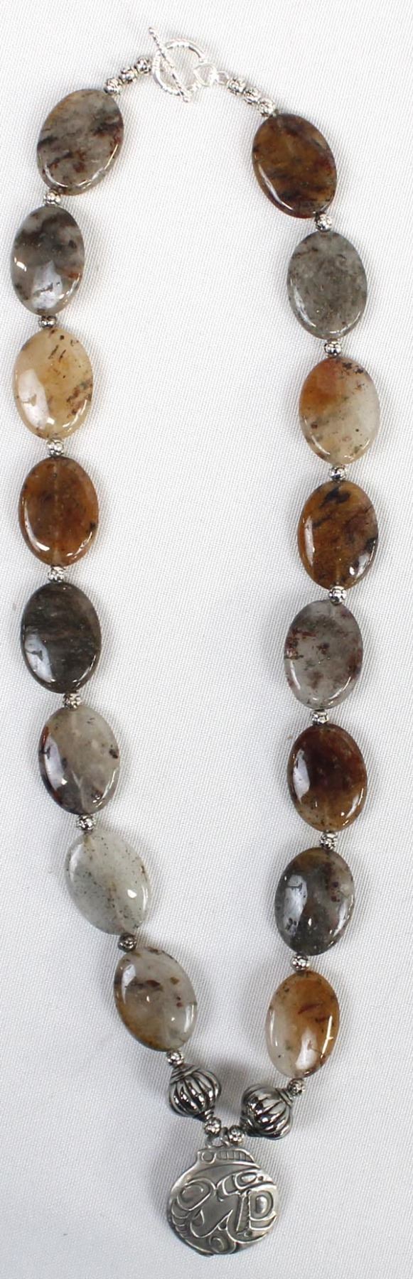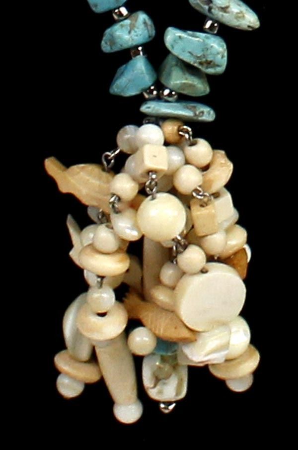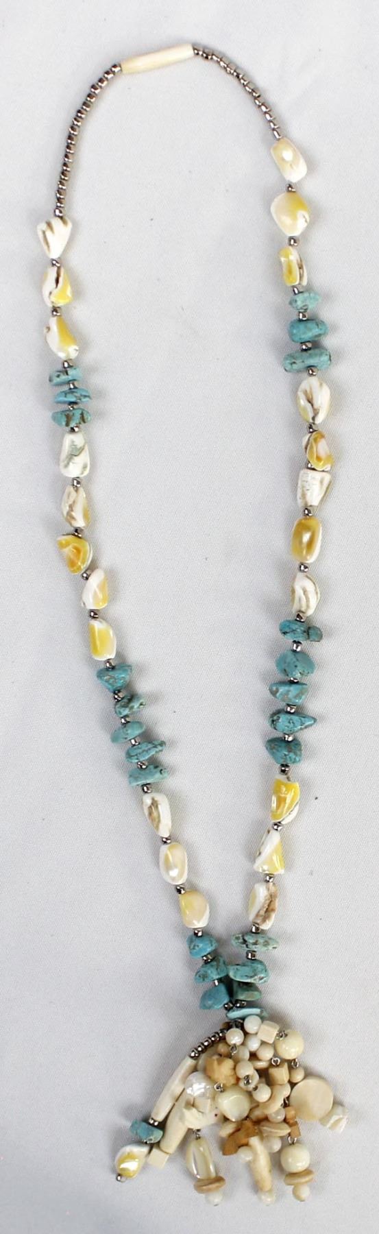 2 Native American Hand Crafted Necklaces by Kathy Kills Thunder. The Moss Agate Pendant Necklace Measures 20 " end to end while the Turquoise and Gold Lip Shell Bead Necklace measures 32" end to end