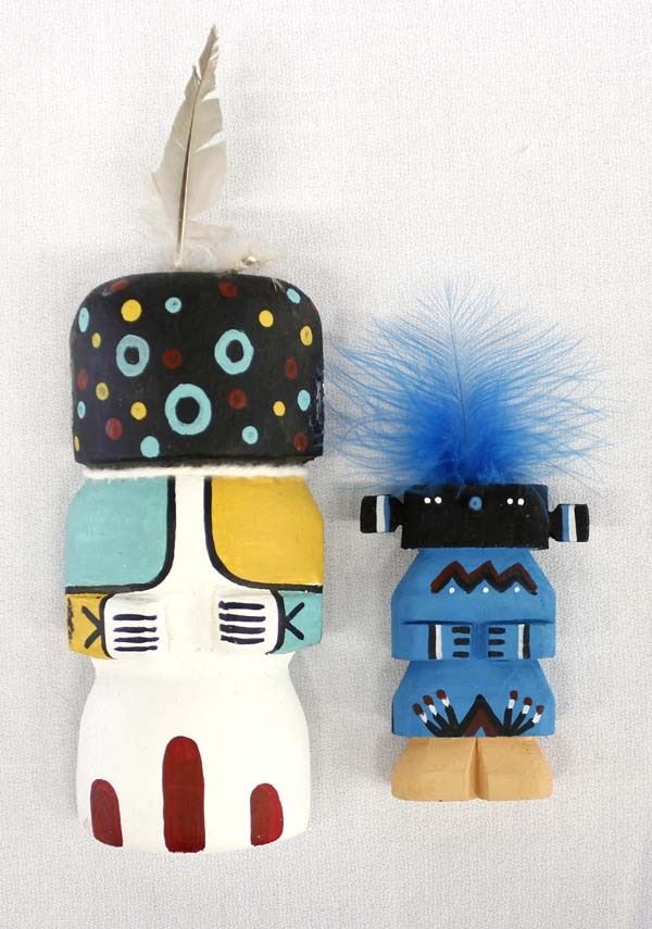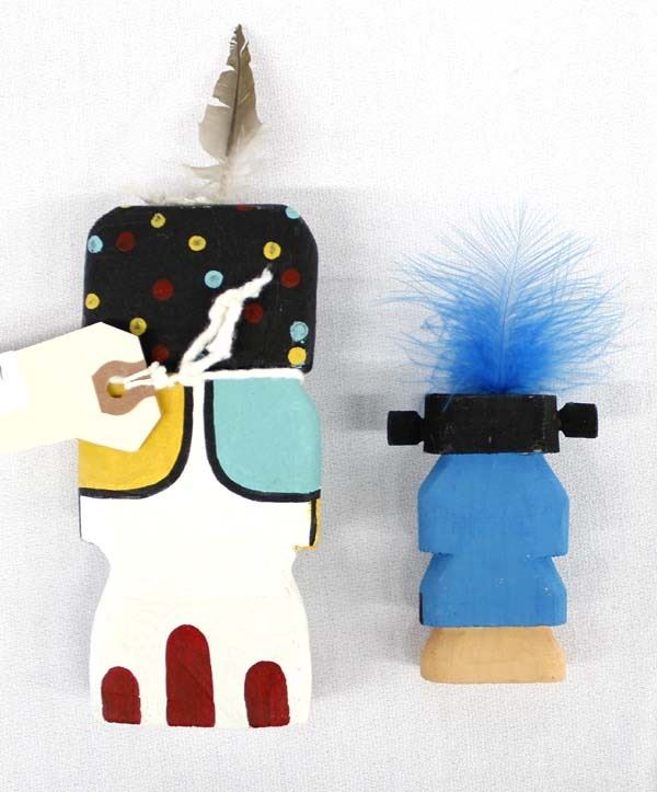 2 Native American Hopi Kachinas, includes 1. Small Blue embellished with blue feather, measuring 5''H x 2.25''W (includes feather) 2. Kokosori Kachina by Charles Pete Wadsworth, measures 5.5''L x 2.5''W (feather not included)