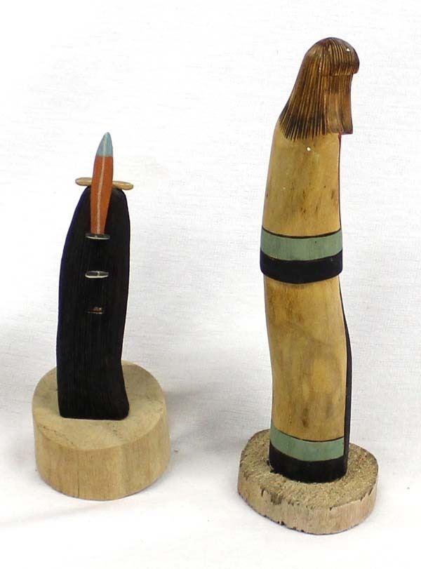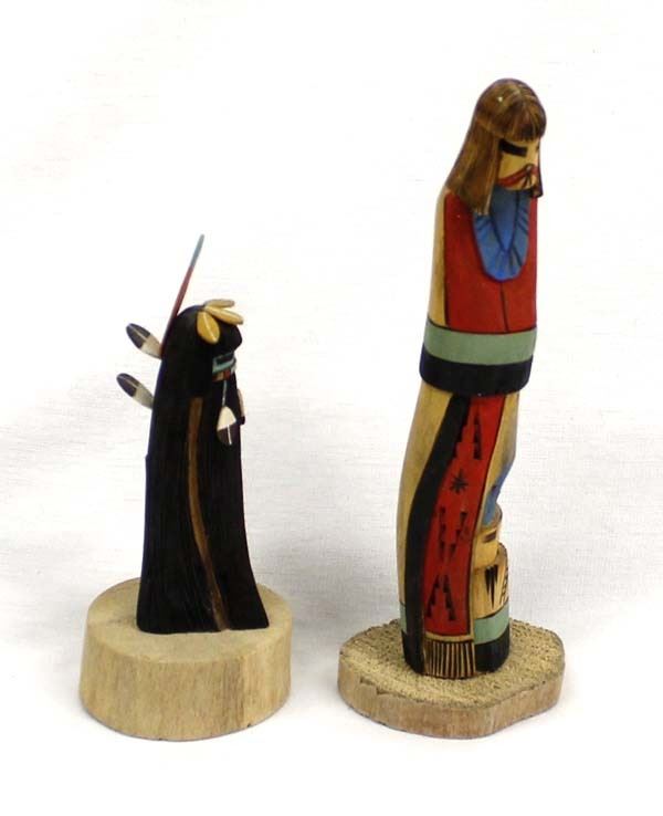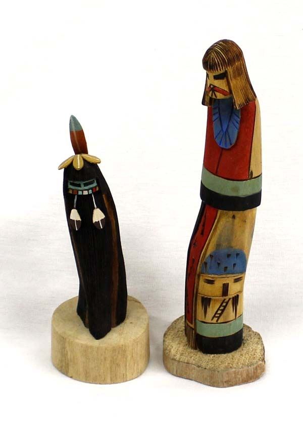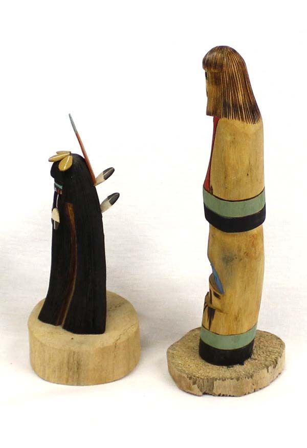 2 Native American Hopi Kachinas, includes 1. Hopi Shalako Kachina, unsigned and measures 2'' x 7.5'' x 2'', beautifully hand carved, wood burned, and painted, lovely colors 2. Hopi Longhair Kachina by Kayenta Jackson, measures 2.25'' x 6'' x 2'', comes with COA