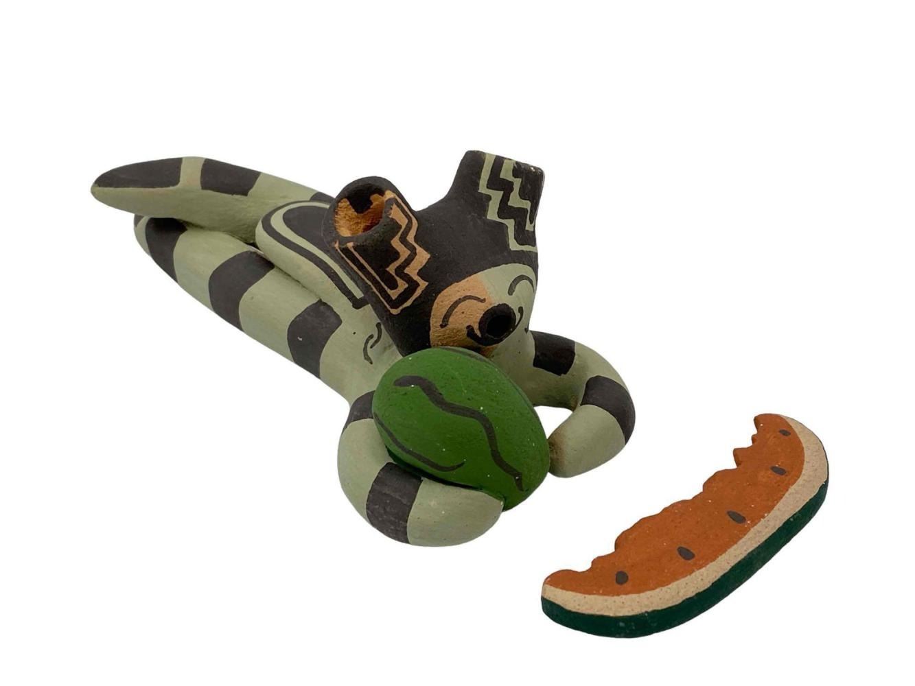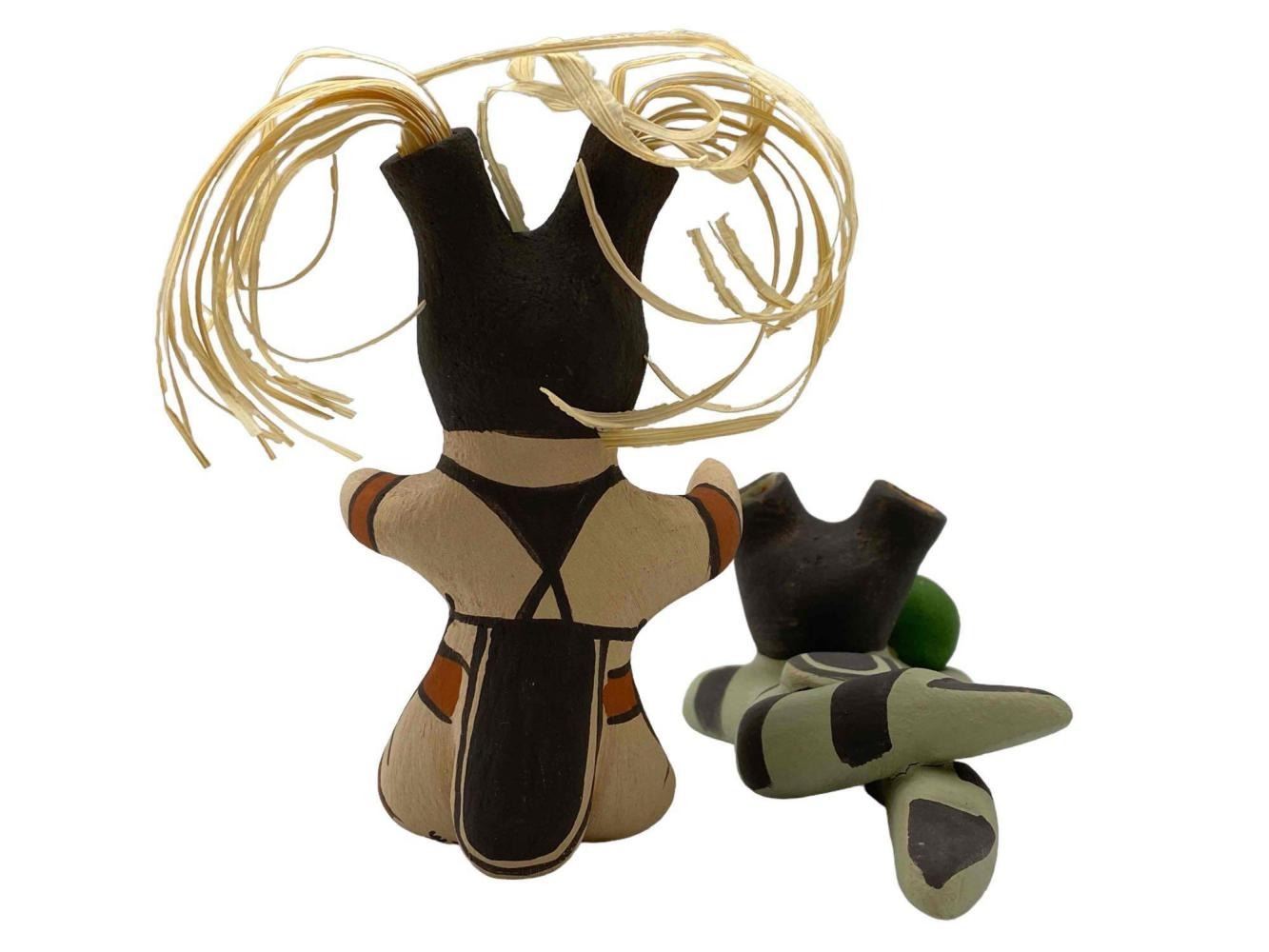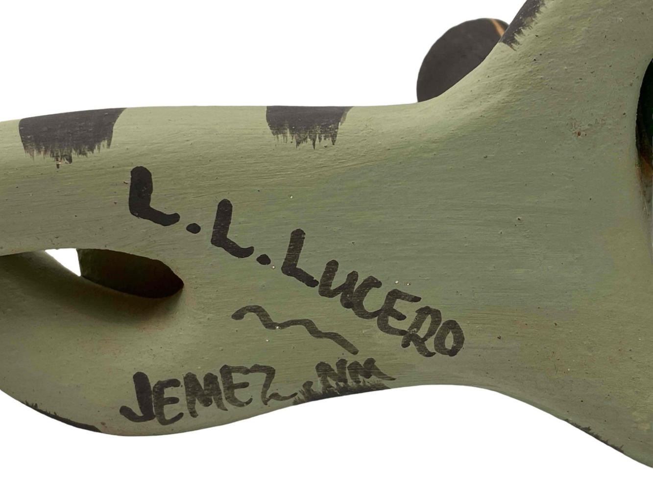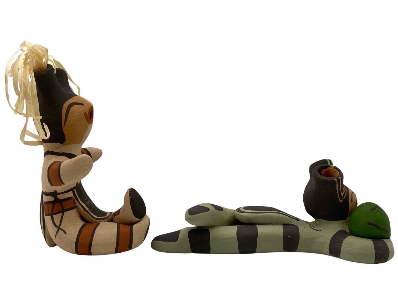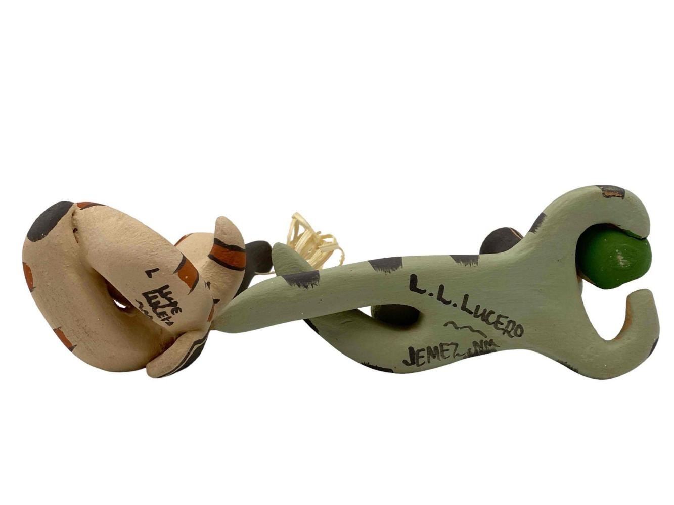 2 Native American Jemez Pueblo Pottery Happy Figures, Signed L. Lupe Lucero. Approximately 4.0H x 2.25W x 2.375D in. Approximately 5.375L x 2.375W x 2.0H in.