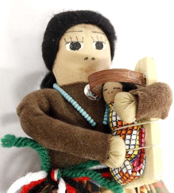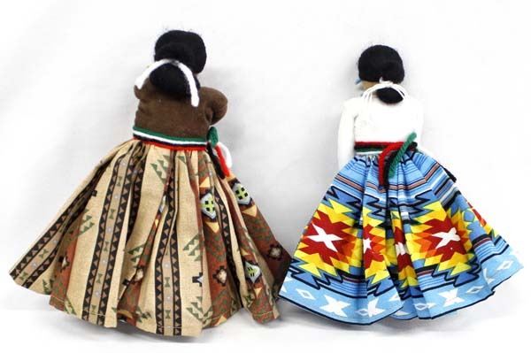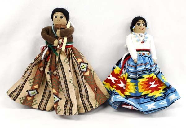 2 Native American Navajo Cloth Dolls, includes #1 Doll by Stephanie Yazzie wearing traditional dress and embellished with beaded necklace and earrings, hand painted face and signed by the artist #2 Doll by Brenda Pear wearing traditional dress and carrying cradle board with baby, embellished with yarn, beaded necklace, sequin concho pin, hand painted face and signed by the artist, this is the larger of the two dolls measuring 7.5''H x 7.75''W x 2.5''D