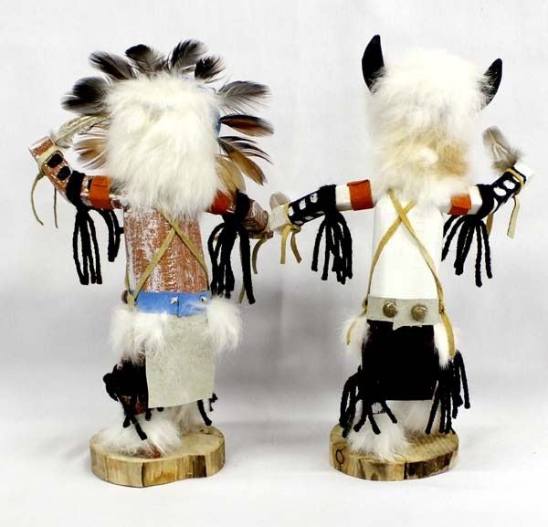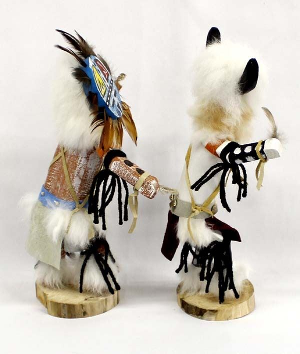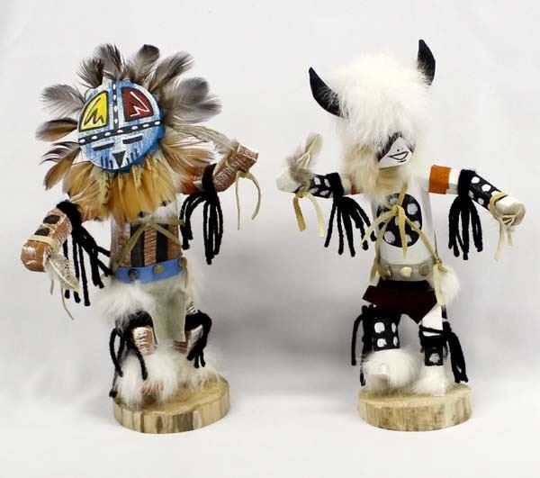 2 Native American Navajo Kachinas by Ina James , includes: 1. Buffalo Dancer embellished with rabbit fur, yarn, shells, feathers, and leather 2. Sun Face embellished with feathers, yarn, leather, shells, and leather, largest measuares 7'' x 11'', both are signed