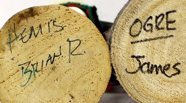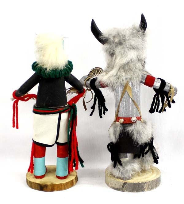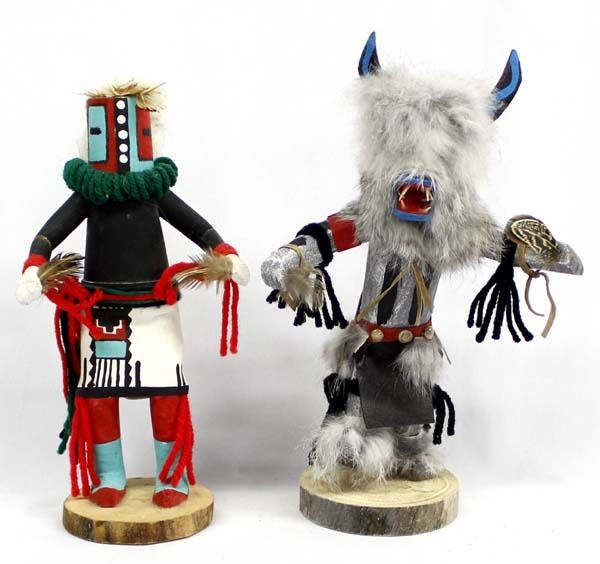 2 Native American Navajo Kachinas, includes Hemis by Brian R. and Ogre by Ina James, largest measures 6'' x 10'' and both are signed, embellished with yarn, feathers, leather, rabbit fur, and shells