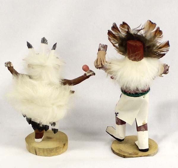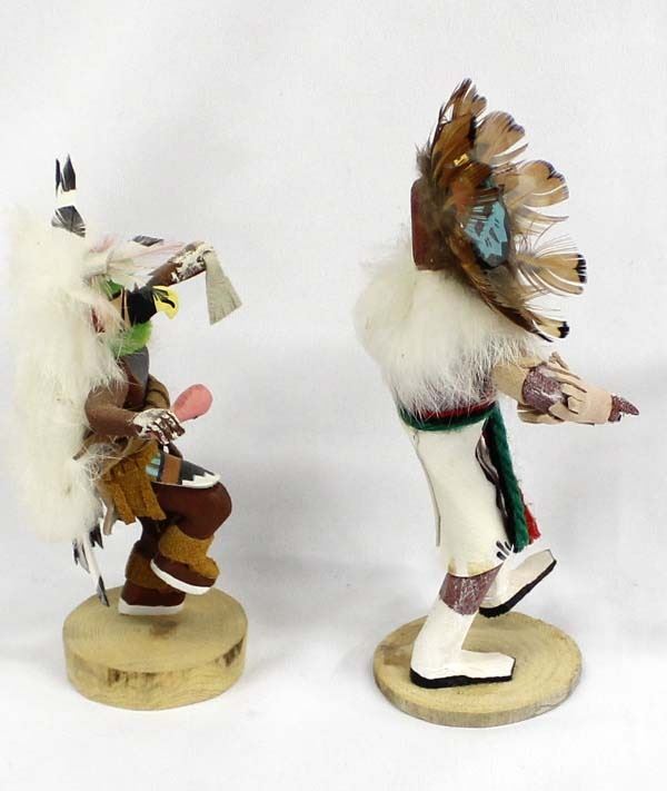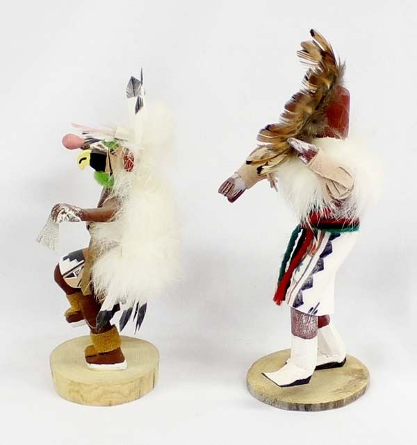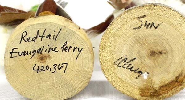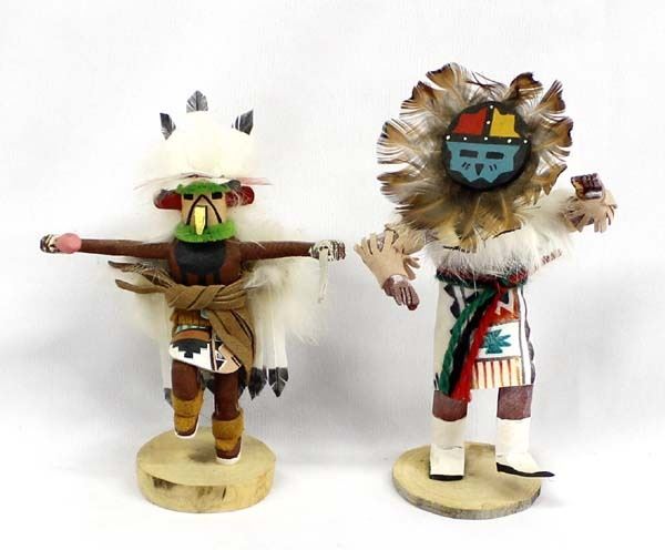 2 Native American Navajo Kachinas, largest measures 7.5''H x 4.5''W, includes: 1. Sun Face, signed on the bottom and is embellished with feathers, felt, yarn, and painted canvas like cloth 2. Red Tail by Evangeline Perry, signed on the bottom and is embellished with feathers, leather, pipe cleaners, and rabbit fur