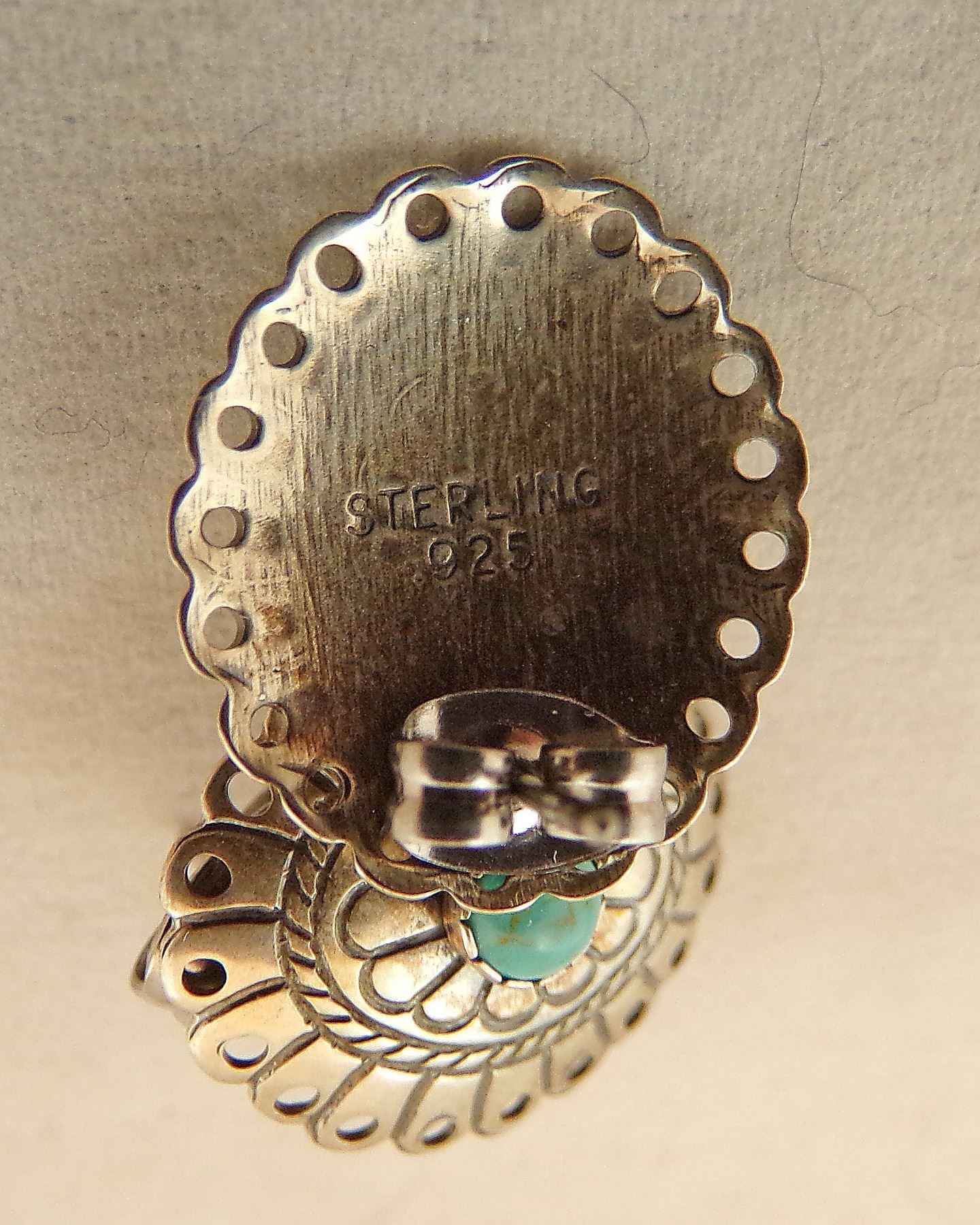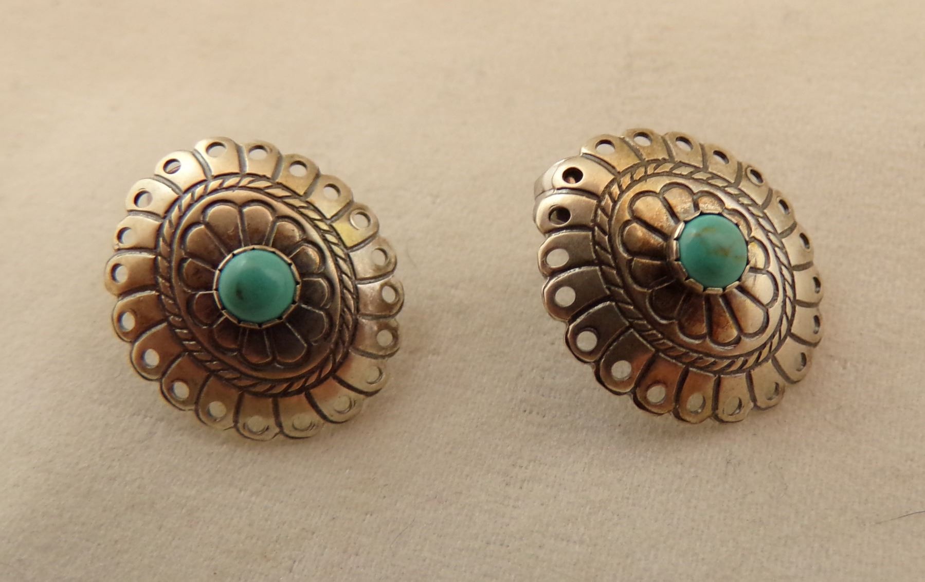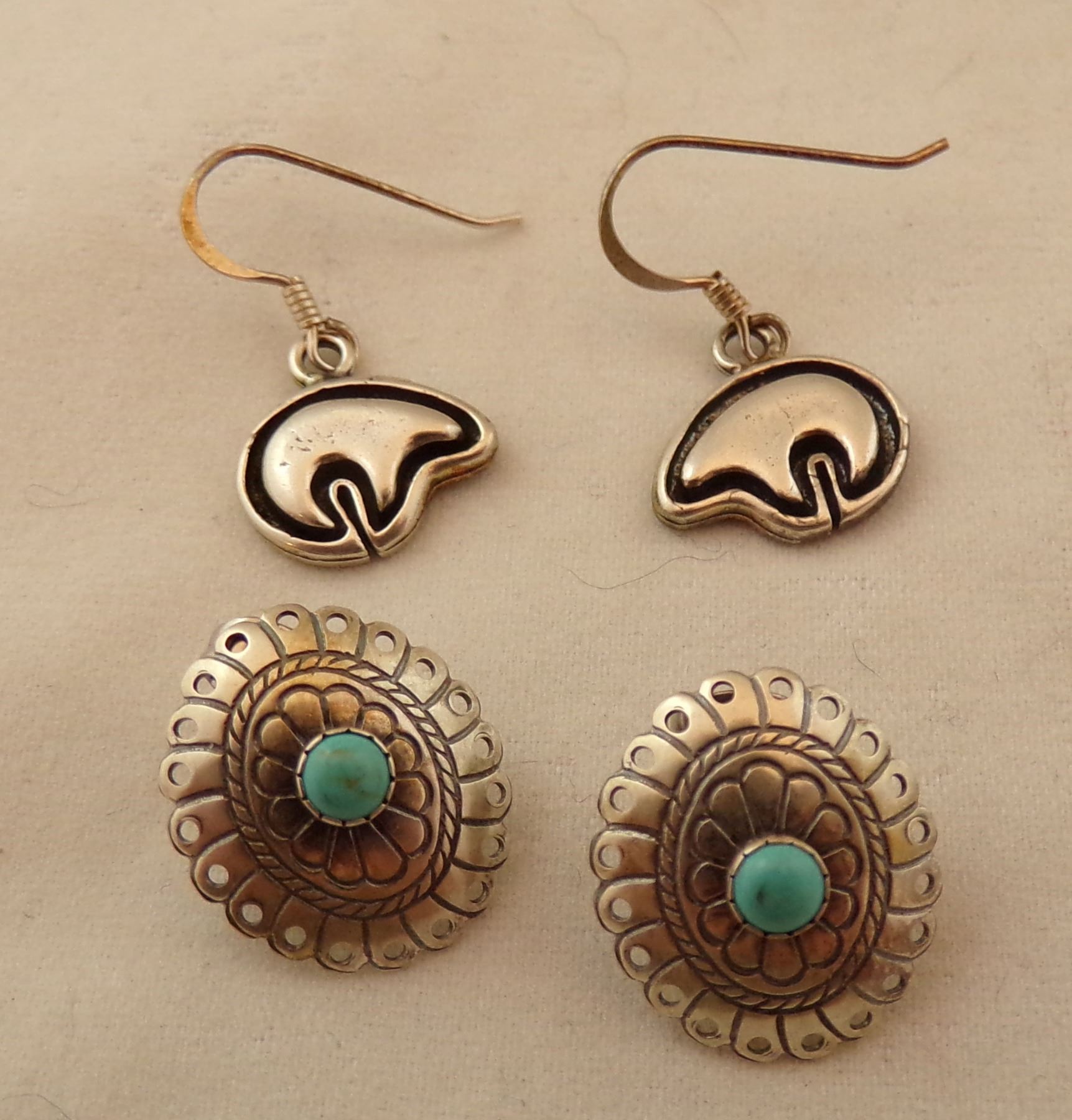 2 Native American Navajo Sterling Earrings, includes bears and conchos with turquoise, both are stamped sterling, longest measure 1''L which includes the wire