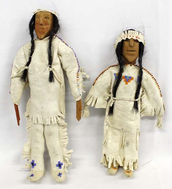 2 Vintage Native American Pine Ridge Reservation Plains Indian Wood Dolls, measures 6'' x 13'', carved wood hands and face, hide bodies and hide clothing embellished with beadwork, horse hair braids