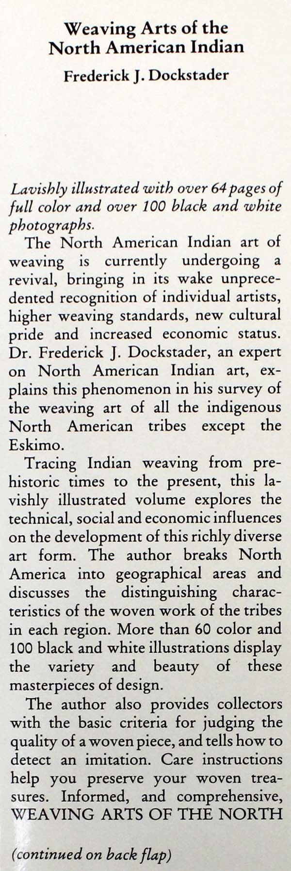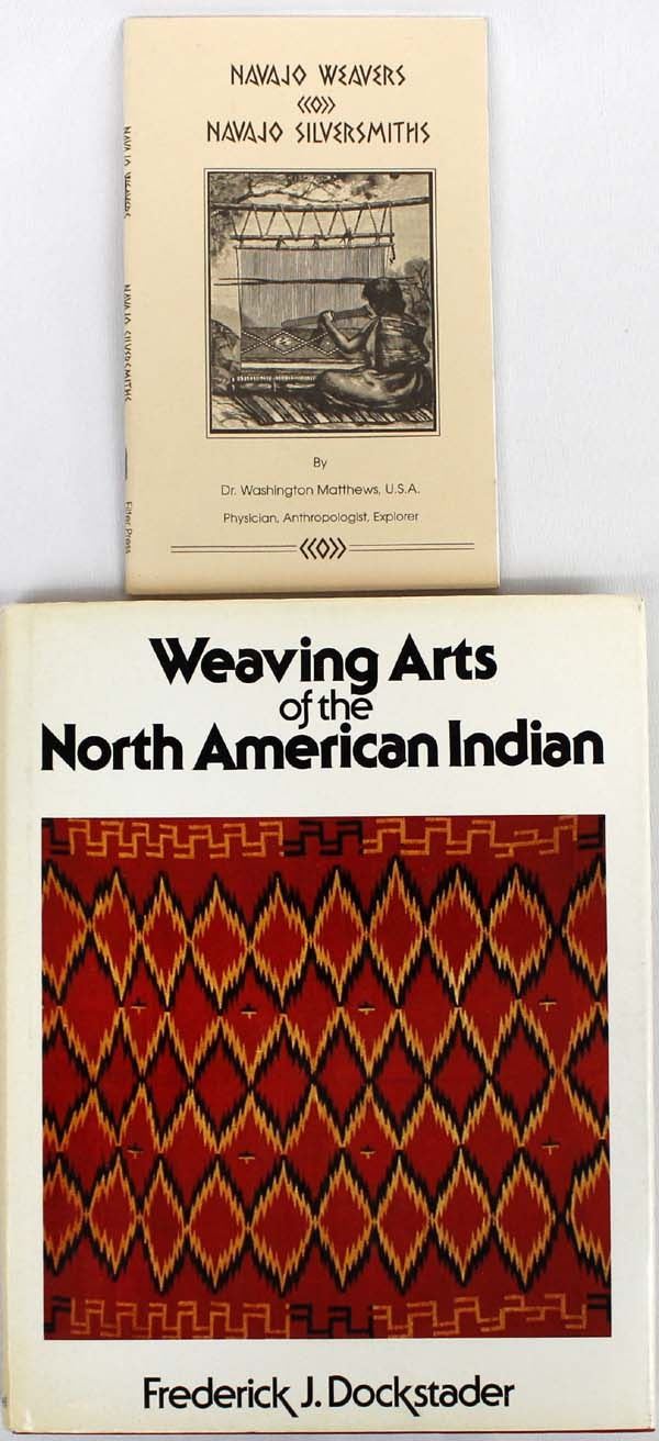 2 Native American Reference Books, includes 1. Navajo Weavers and Navajo Silversmiths by Dr. Washington Matthews, U.S.A. Physician, Anthropologist, Explorer, 1968 Filter Press, softback book 2. Weaving Arts of the North American Indian by Frederick J. Dockstader, 1978 Thomas Y. Crowell New York, hardback book, comes in original book jacket, has name written inside of cover, first published in 1978