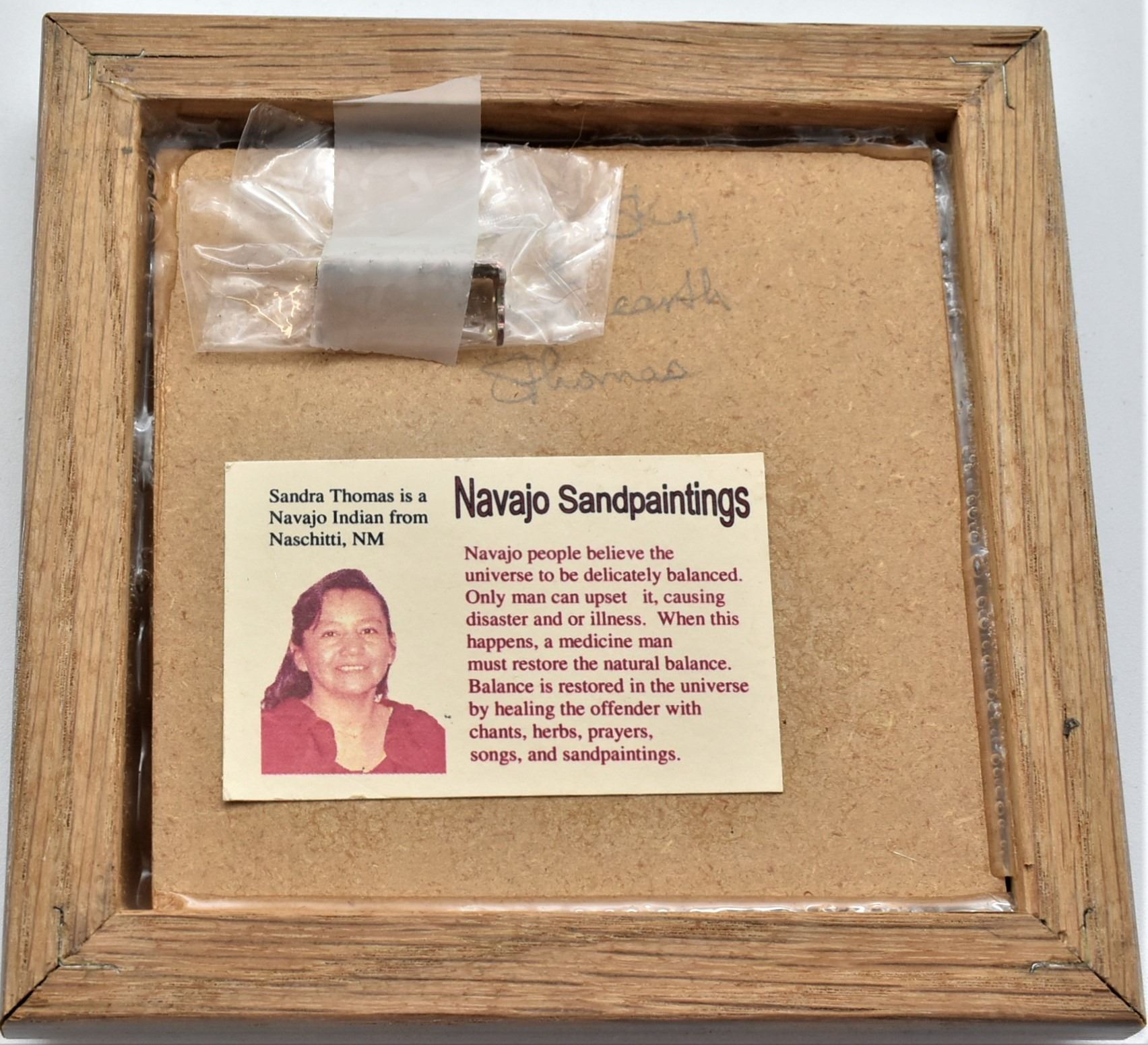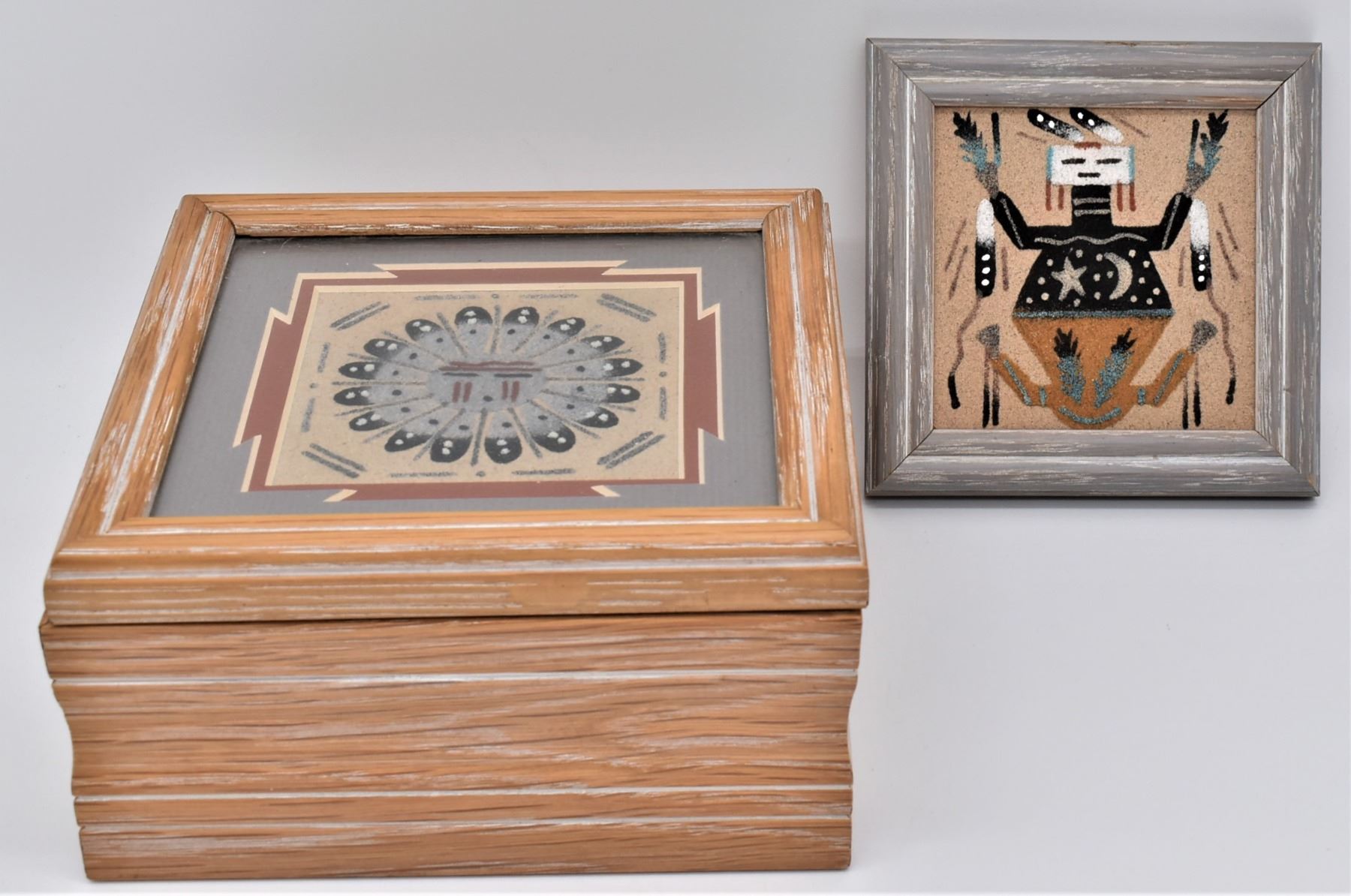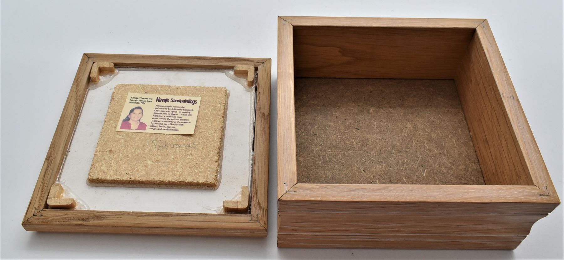 2 Native American Navajo Sand Painting Collectibles by Sandra Thomas of Naschitti NM, includes Sand Painting ''Father Sky and Mother Earth'' and Lidded Wood Box with Sand Painting under glass on lid, box measures 7'' square x 3.75''H