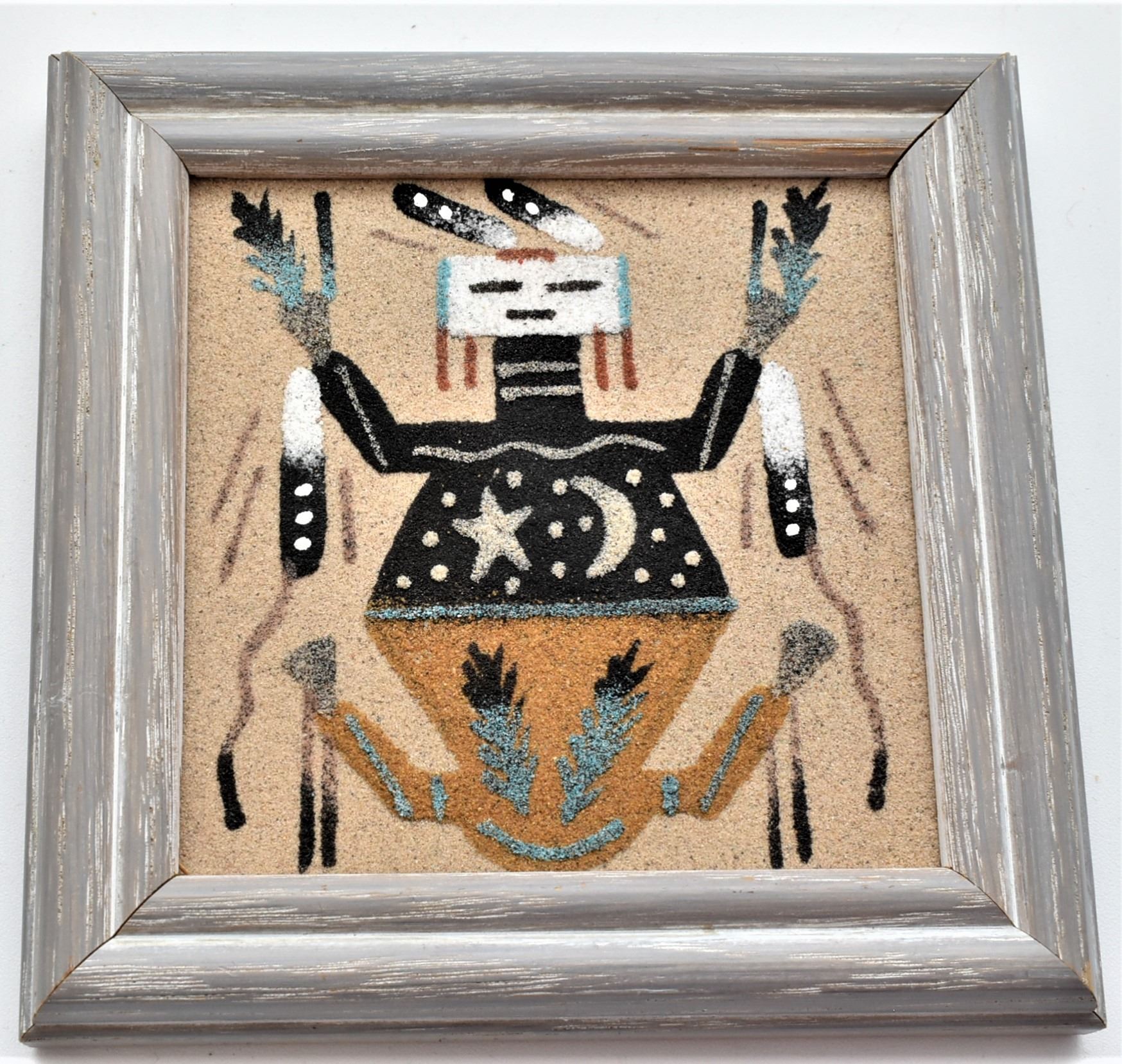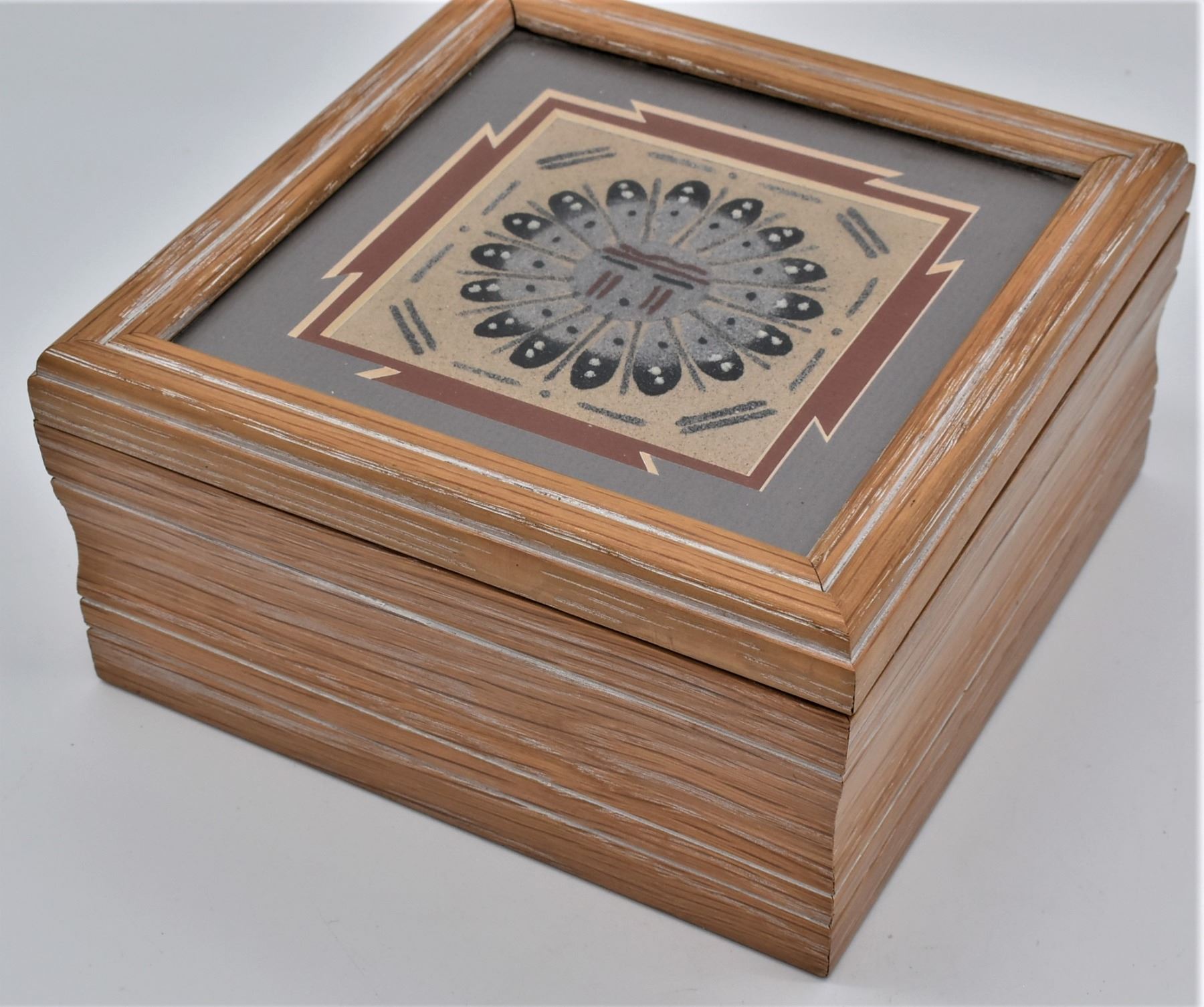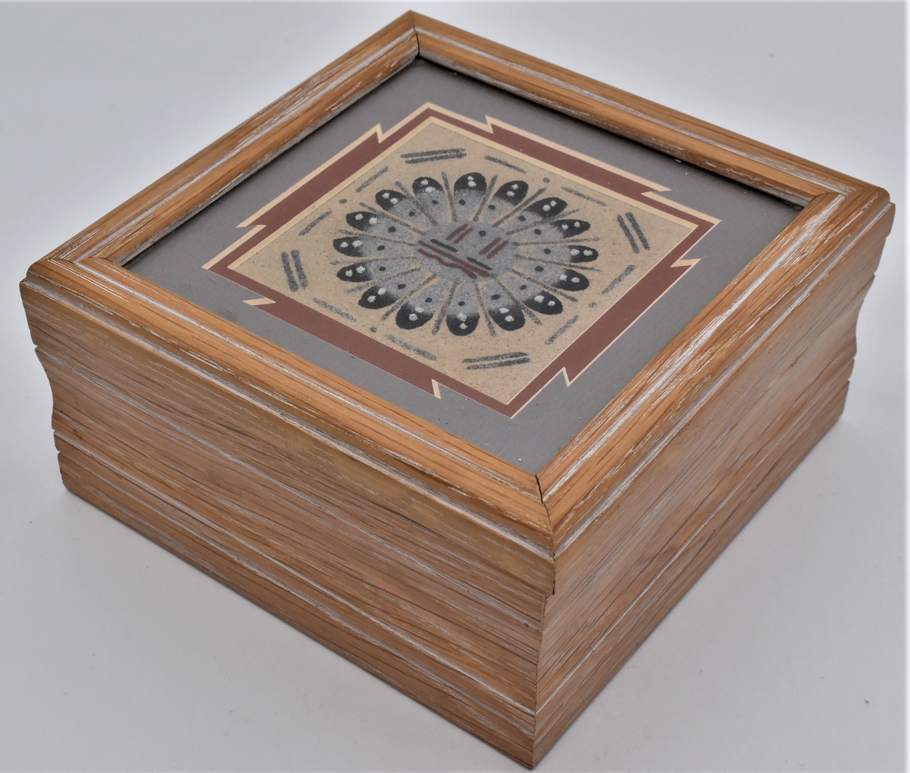 2 Native American Navajo Sand Painting Collectibles by Sandra Thomas of Naschitti NM, includes Sand Painting ''Father Sky and Mother Earth'' and Lidded Wood Box with Sand Painting under glass on lid, box measures 7'' square x 3.75''H