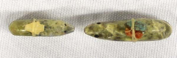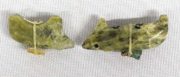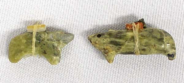 2 Native American Serpentine Fetishes, largest measures 1.5'' x 1'', both have spirit bundles (coral, turquoise, gold lip shell)