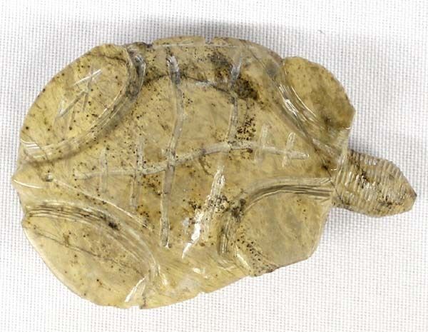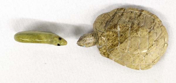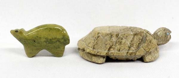 2 Native American Zuni Carved Stone Fetishes, includes: 1. Vintage Carved Serpentine Bear Fetish, measures 1.5''L x .75''W 2. Carved Stone Snapping Turtle by Adrian and Falene Cachini, measures 2.75''L x 1.75''W x .75''H, intialed on the bottom, turquoise eyes