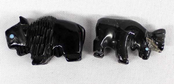 2 Native American Zuni Carved Stone Fetishes, includes 1. Carved Jet Buffalo, largest measures 1'' x 2'' 2. Carved Black Onyx Moose, both have turquoise eyes and are unsigned